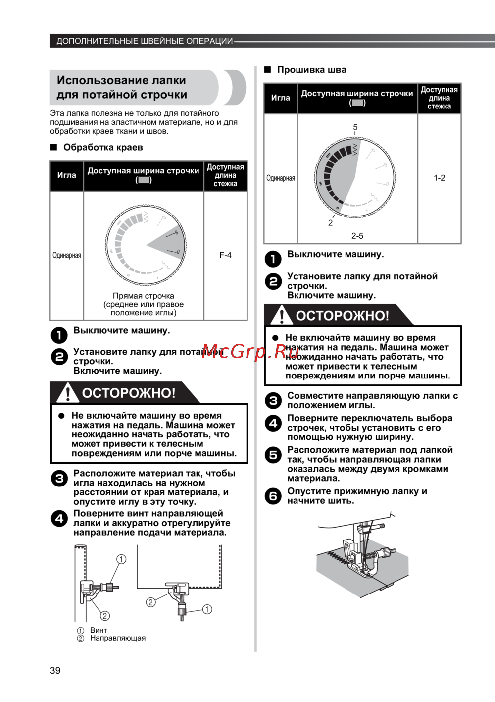 - Расположите материал под лапкой так чтобы направляющая лапки оказалась между двумя кромками материала p.40