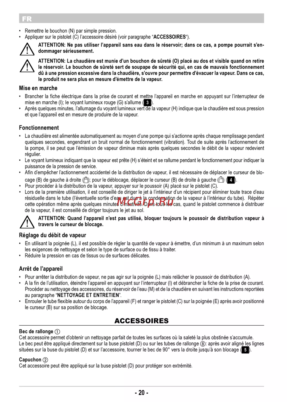 ATTENTION: Ne pas utiliser l’appareil sans eau dans le réservoir; dans ce cas, a pompe pourrait s’en-