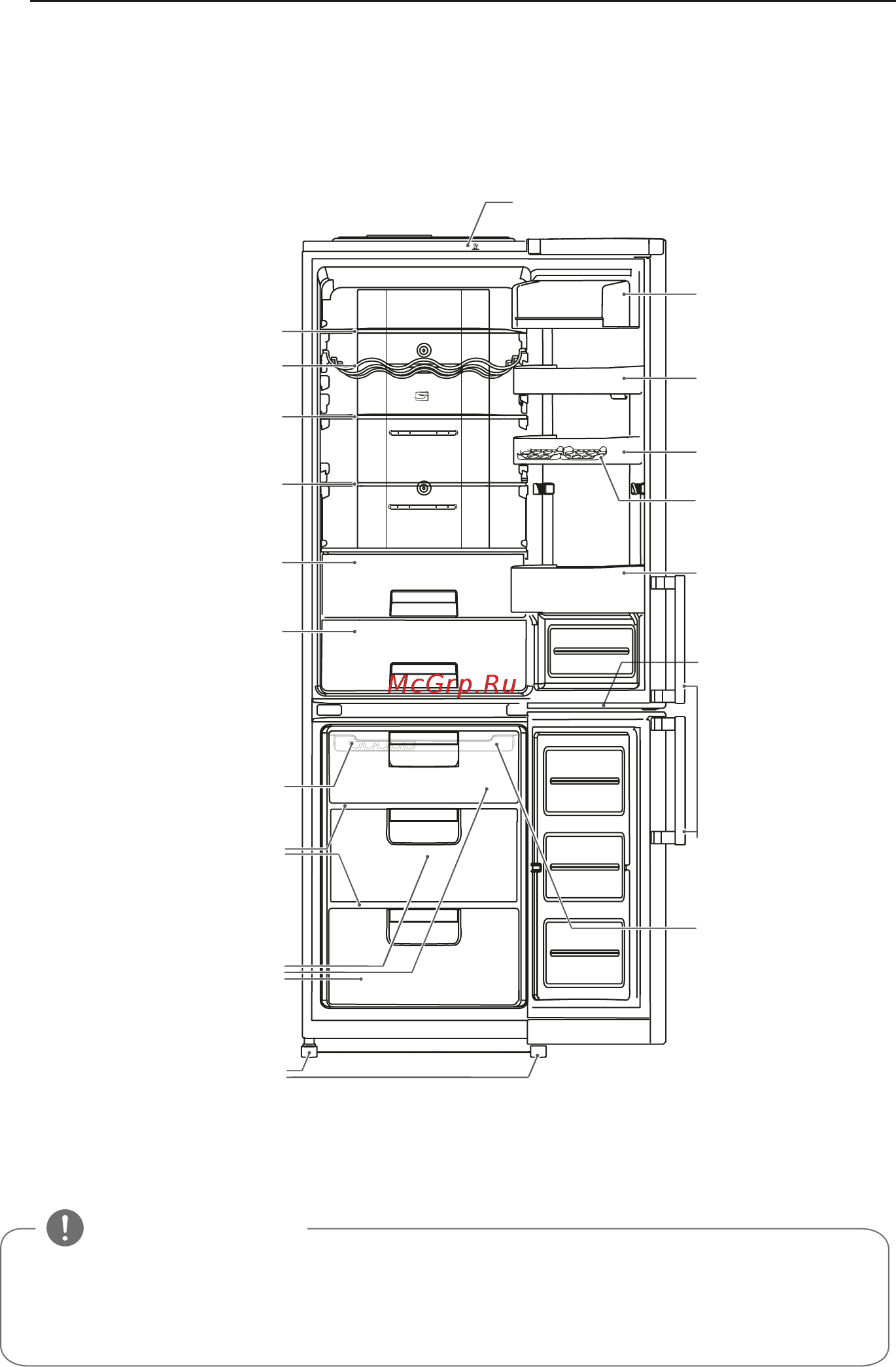 - Если какие либо детали отсутствуют в вашем холодильнике возможно они входят в комплект поставки других моделей компания изготовитель имеет право вносить изменения в комплектацию холодильника без предварительного уведомления p.10