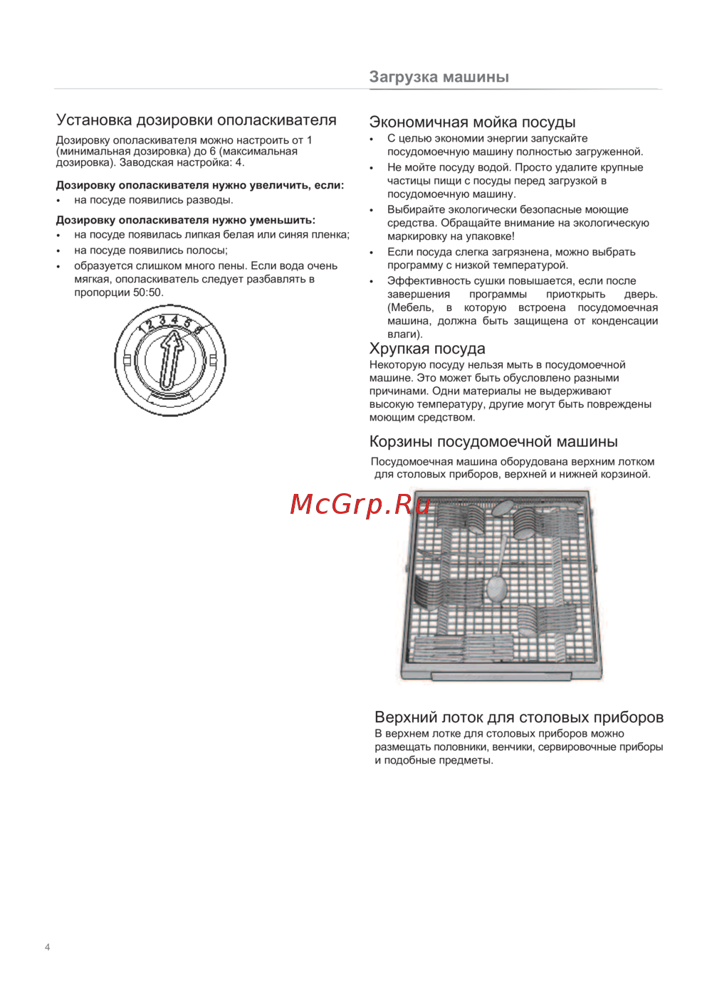 Загрузка машины Установка дозировки ополаскивателя Экономичная мойка посуды Дозировку ополаскивателя можно настроить от 1 минимальная дозировка до 6 максимальная дозировка Заводская настройка 4 С целью экономии энергии запускайте посудомоечную машину полностью загруженной Не мойте посуду водой Просто удалите крупные частицы пищи с посуды перед загрузкой в посудомоечную машину Выбирайте экологически безопасные моющие средства Обращайте внимание на экологическую маркировку на упаковке Если посуда слегка загрязнена можно выбрать программу с низкой температурой Эффективность сушки повышается если после завершения программы приоткрыть дверь Мебель в которую встроена посудомоечная машина должна быть защищена от конденсации влаги Дозировку ополаскивателя нужно увеличить если на посуде появились разводы Дозировку ополаскивателя нужно уменьшить на посуде появилась липкая белая или синяя пленка на посуде появились полосы образуется слишком много пены Если вода очень мягкая ополаскиватель следует разбавлять в пропорции 50 50 Хрупкая посуда Некоторую посуду нельзя мыть в посудомоечной машине Это может быть обусловлено разными причинами Одни материалы не выдерживают высокую температуру другие могут быть повреждены моющим средством Корзины посудомоечной машины Посудомоечная машина оборудована верхним лотком для столовых приборов верхней и нижней корзиной Верхний лоток для столовых приборов В верхнем лотке для столовых приборов можно размещать половники венчики сервировочные приборы и подобные предметы 4