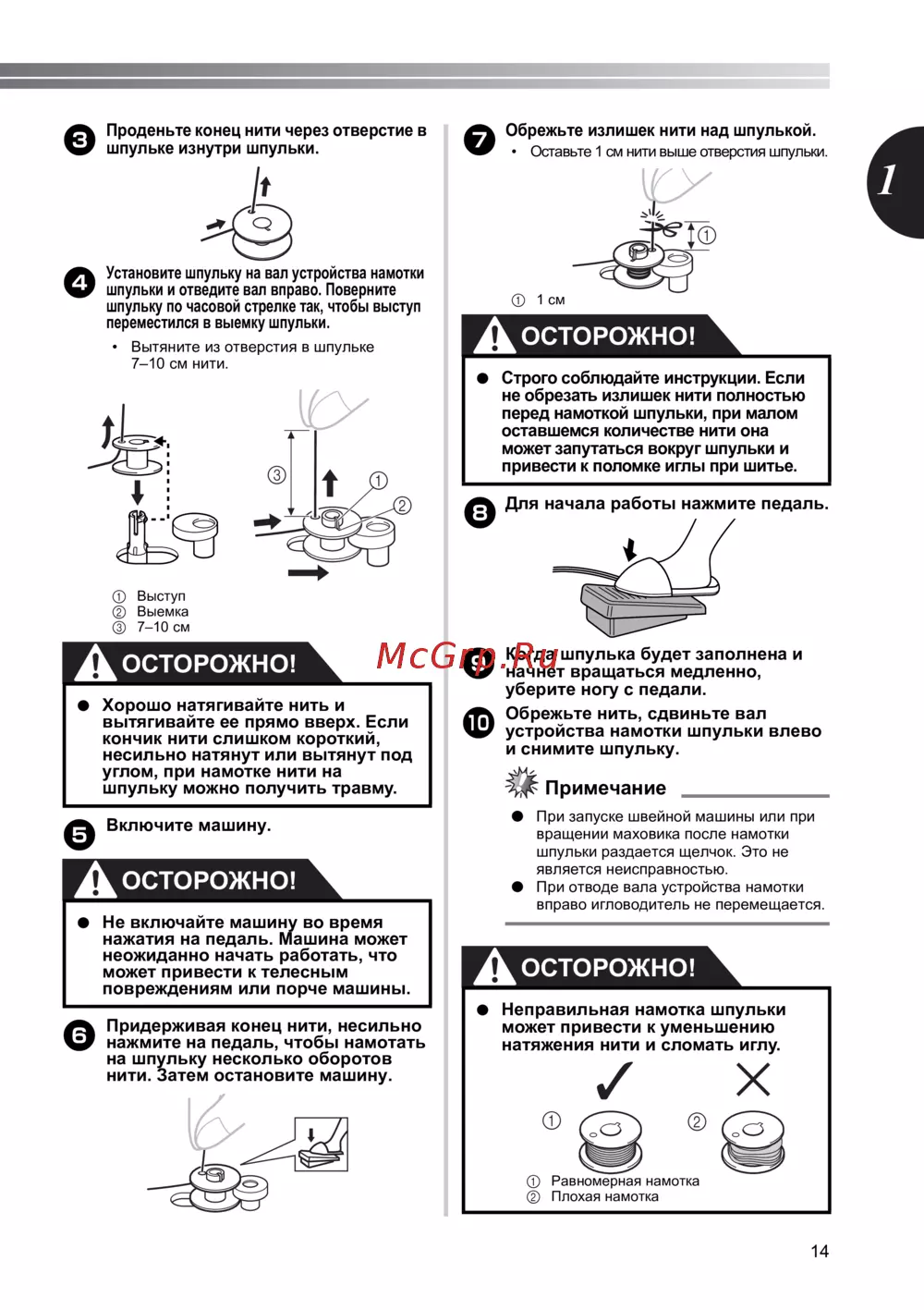 - Убедитесь что шпульный колпачок вставлен правильно так как в противном случае игла может сломаться p.42
