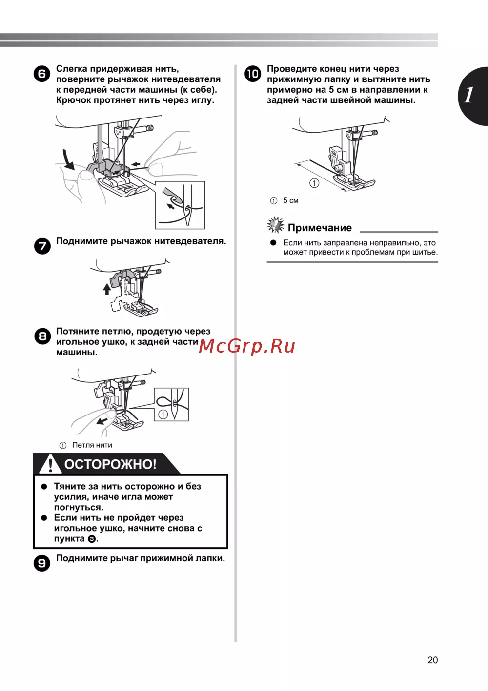 - Убедитесь что шпульный колпачок вставлен правильно так как в противном случае игла может сломаться p.42