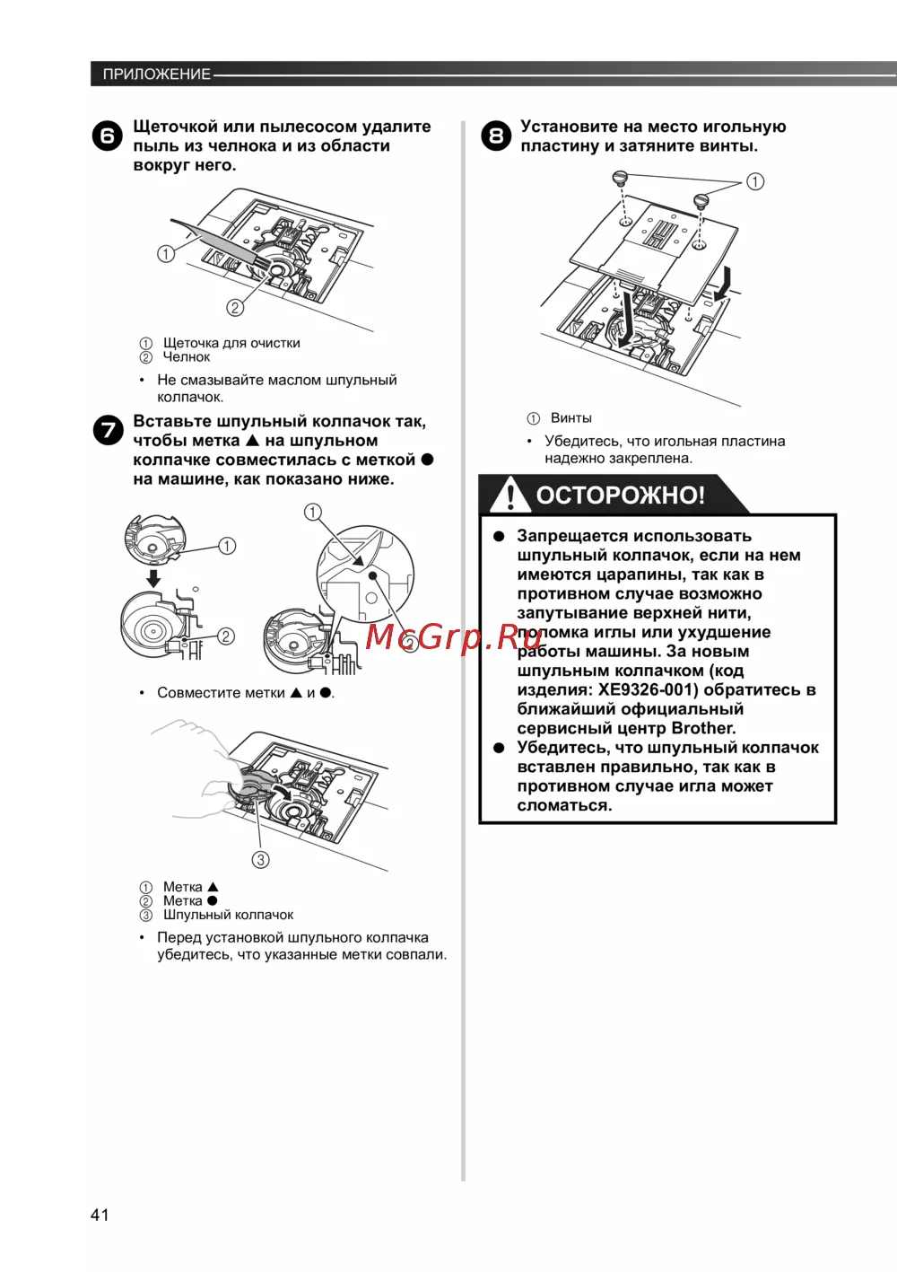 - Запрещается использовать шпульный колпачок если на нем имеются царапины так как в противном случае возможно запутывание верхней нити поломка иглы или ухудшение работы машины за новым шпульным колпачком код изделия xe9326 001 обратитесь в ближайший официальный сервисный центр brother p.42