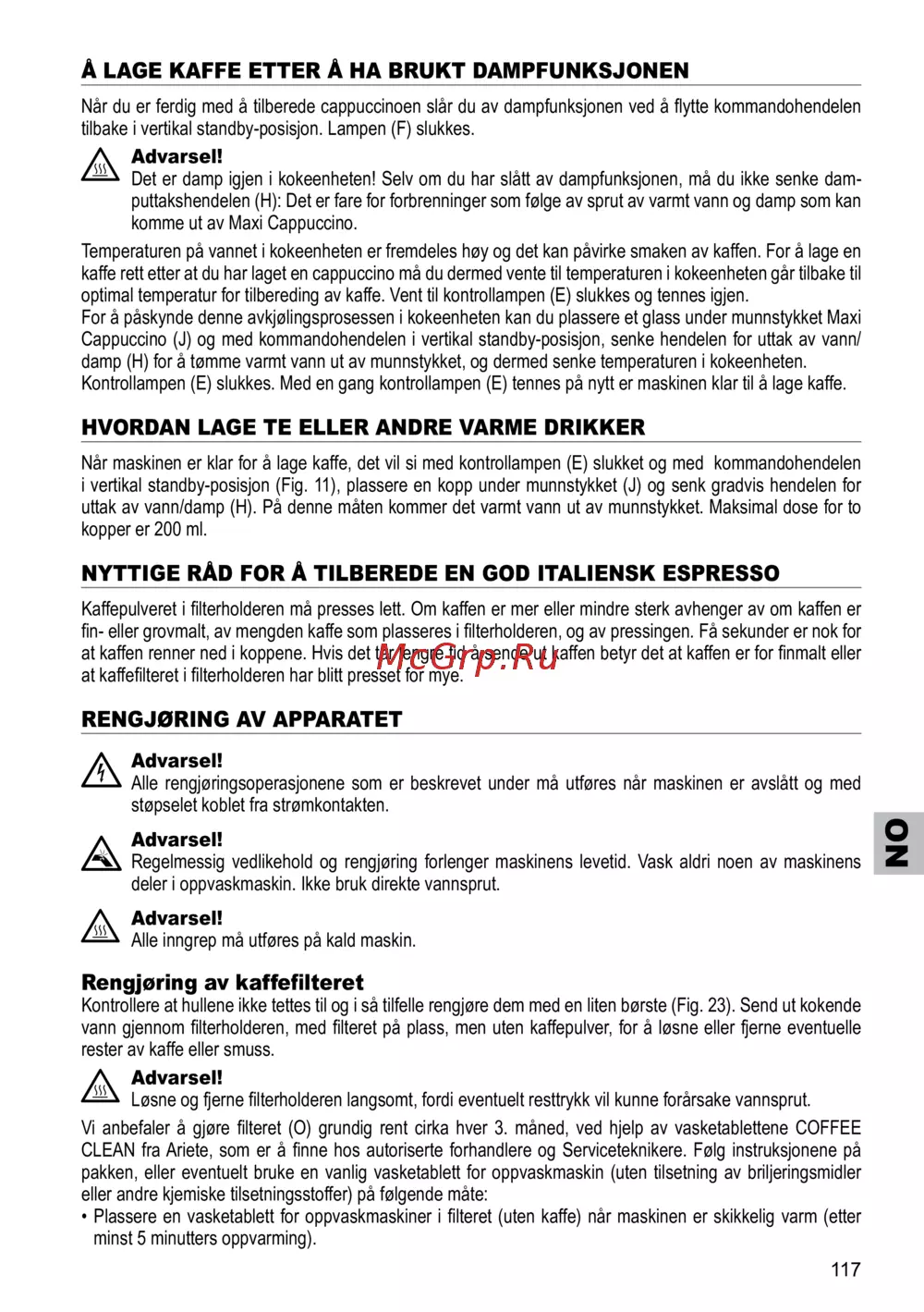 - Hålet i filtret o som innehåller kaffepulver är tilltäppt ta långsamt och försiktigt bort och avlägsna filterhållaren eftersom det resterande trycket annars kan leda till att det sprutar vatten rengör hålet i filtret med en liten borste eller en nål rengör noga filtret med hjälp av tabletterna för rengöring coffee clean från ariete och följ instruktionerna i förpackningen p.128