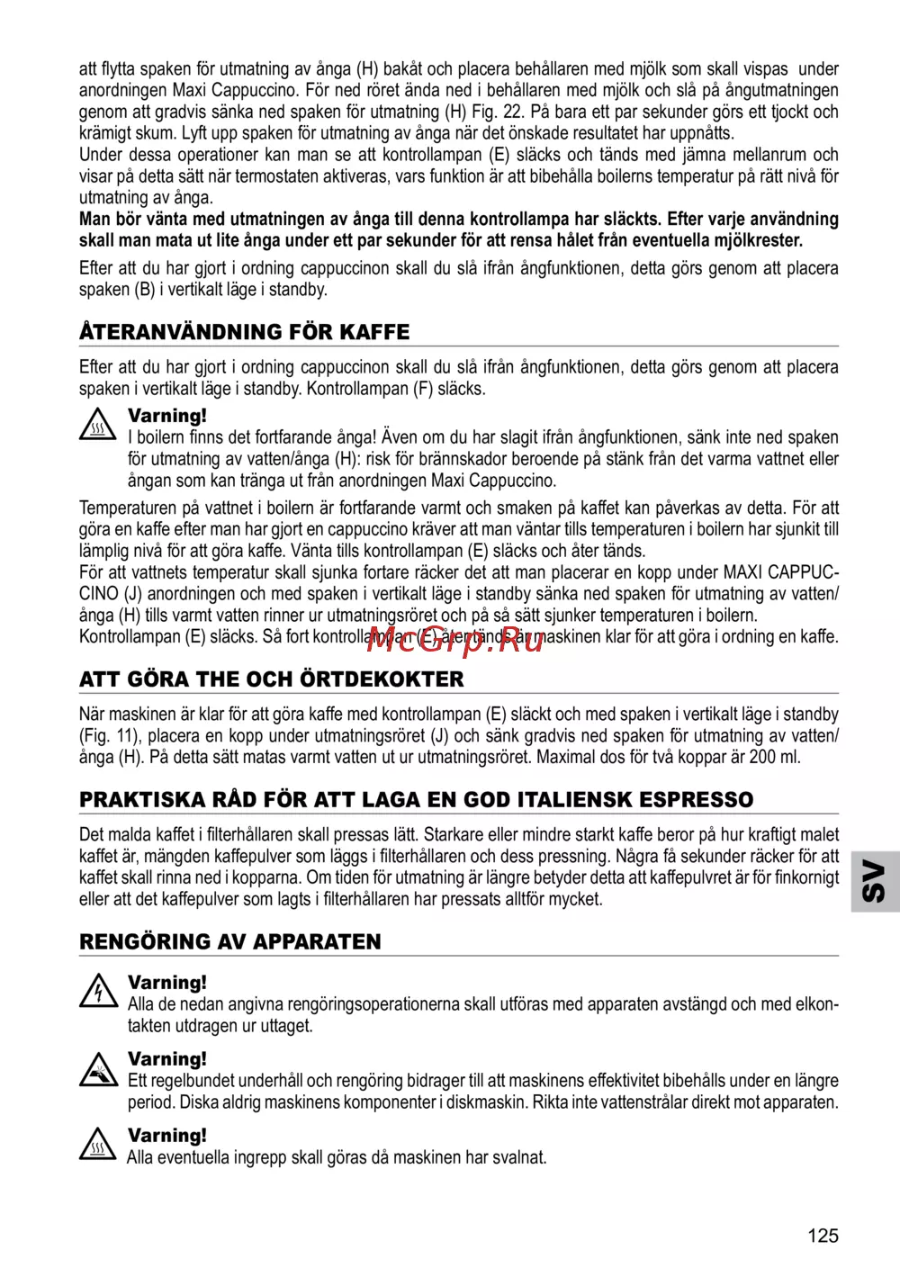 - Hålet i filtret o som innehåller kaffepulver är tilltäppt ta långsamt och försiktigt bort och avlägsna filterhållaren eftersom det resterande trycket annars kan leda till att det sprutar vatten rengör hålet i filtret med en liten borste eller en nål rengör noga filtret med hjälp av tabletterna för rengöring coffee clean från ariete och följ instruktionerna i förpackningen p.128