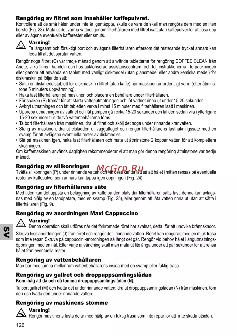 - Hålet i filtret o som innehåller kaffepulver är tilltäppt ta långsamt och försiktigt bort och avlägsna filterhållaren eftersom det resterande trycket annars kan leda till att det sprutar vatten rengör hålet i filtret med en liten borste eller en nål rengör noga filtret med hjälp av tabletterna för rengöring coffee clean från ariete och följ instruktionerna i förpackningen p.128