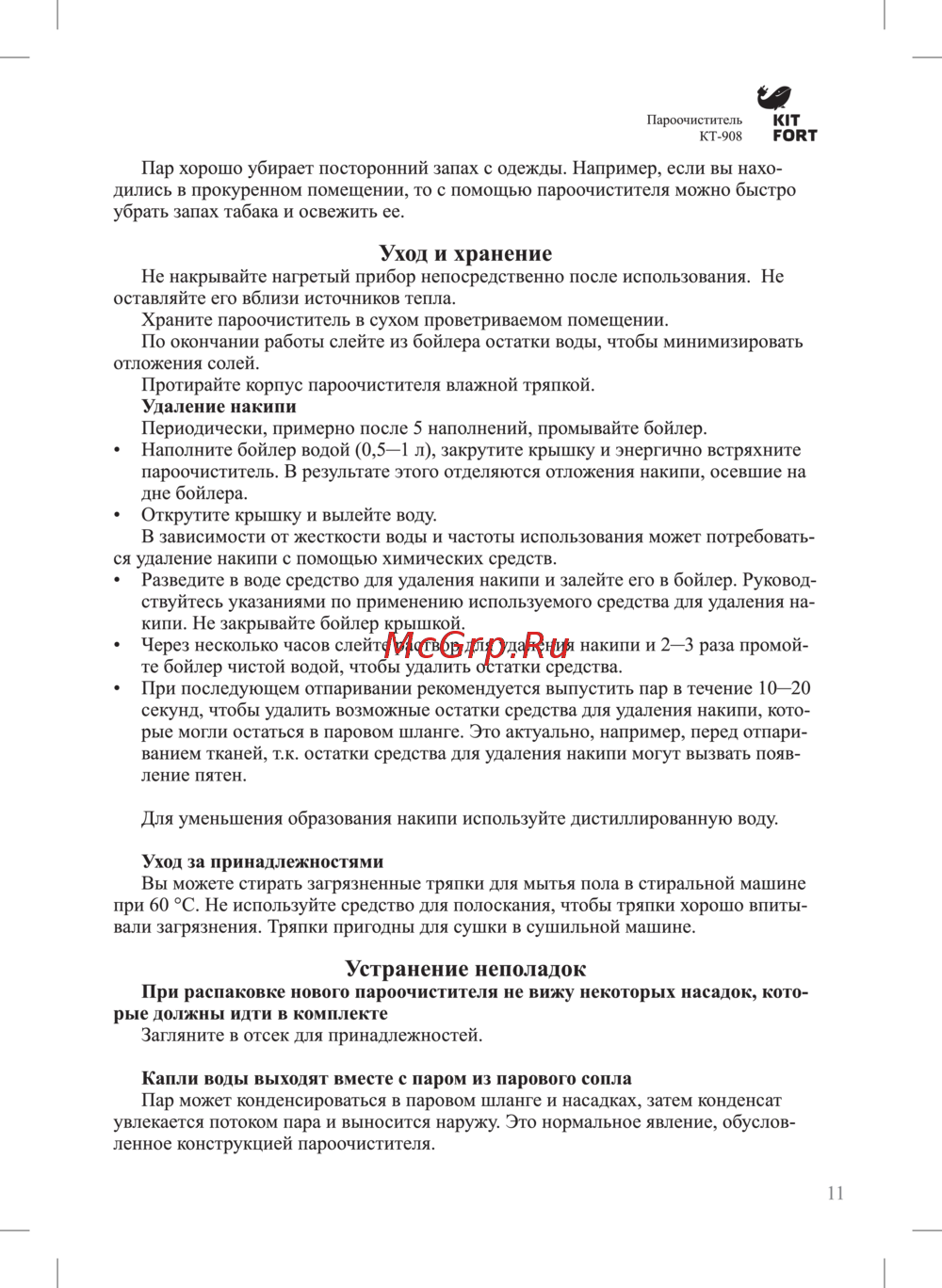 Пароочиститель KIT КТ 908 FORT Пар хорошо убирает посторонний запах с одежды Например если вы нахо дились в прокуренном помещении то с помощью пароочистителя можно быстро убрать запах табака и освежить ее Уход и хранение Не накрывайте нагретый прибор непосредственно после использования Не оставляйте его вблизи источников тепла Храните пароочиститель в сухом проветриваемом помещении По окончании работы слейте из бойлера остатки воды чтобы минимизировать отложения солей Протирайте корпус пароочистителя влажной тряпкой Удаление накипи Периодически примерно после 5 наполнений промывайте бойлер Наполните бойлер водой 0 5 1 л закрутите крышку и энергично встряхните пароочиститель В результате этого отделяются отложения накипи осевшие на дне бойлера Открутите крышку и вылейте воду В зависимости от жесткости воды и частоты использования может потребовать ся удаление накипи с помощью химических средств Разведите в воде средство для удаления накипи и залейте его в бойлер Руковод ствуйтесь указаниями по применению используемого средства для удаления на кипи Не закрывайте бойлер крышкой Через несколько часов слейте раствор для удаления накипи и 2 3 раза промой те бойлер чистой водой чтобы удалить остатки средства При последующем отпаривании рекомендуется выпустить пар в течение 10 20 секунд чтобы удалить возможные остатки средства для удаления накипи кото рые могли остаться в паровом шланге Это актуально например перед отпари ванием тканей т к остатки средства для удаления накипи могут вызвать появ ление пятен Для уменьшения образования накипи используйте дистиллированную воду Уход за принадлежностями Вы можете стирать загрязненные тряпки для мытья пола в стиральной машине при 60 C Не используйте средство для полоскания чтобы тряпки хорошо впиты вали загрязнения Тряпки пригодны для сушки в сушильной машине Устранение неполадок При распаковке нового пароочистителя не вижу некоторых насадок кото рые должны идти в комплекте Загляните в отсек для принадлежностей Капли воды выходят вместе с паром из парового сопла Пар может конденсироваться в паровом шланге и насадках затем конденсат увлекается потоком пара и выносится наружу Это нормальное явление обуслов ленное конструкцией пароочистителя 11