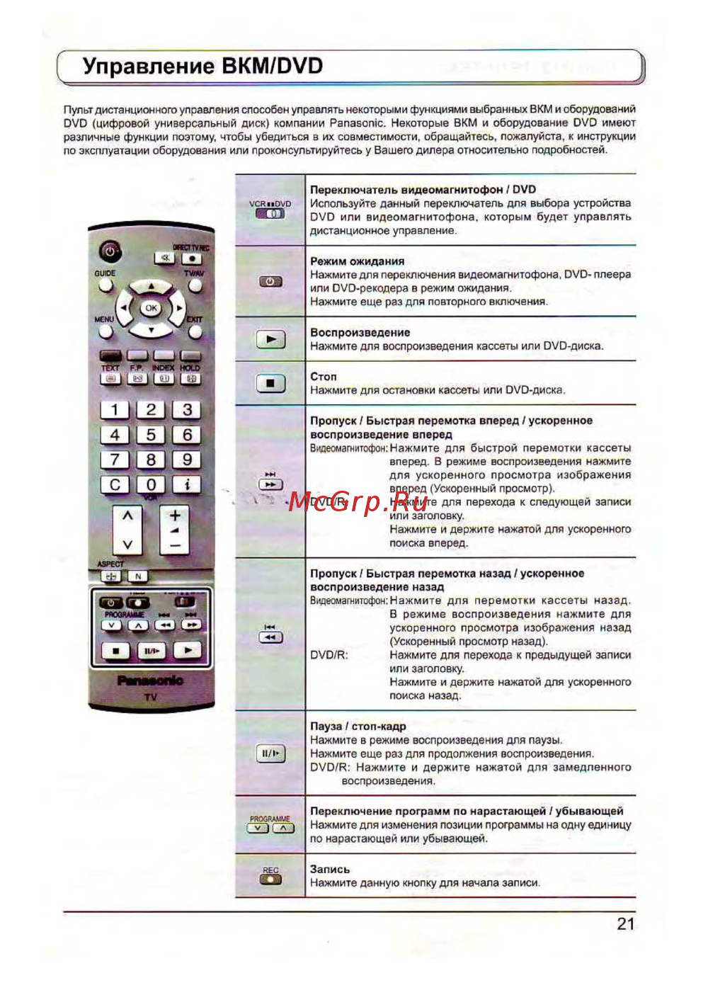 Управление BKM DVD Пульт дистанционного управления способен управлять некоторыми функциями выбранных ВКМ и оборудований DVD цифровой универсальный диск компании Panasonic Некоторые ВКМ и оборудование DVD имеют различные функции поэтому чтобы убедиться в их совместимости обращайтесь пожалуйста к инструкции по эксплуатации оборудования или проконсультируйтесь у Вашего дилера относительно подробностей О VCRuDVD Переключатель видеомагнитофон DVD Используйте данный переключатель для DVD или видеомагнитофона которым дистанционное управление выбора будет Режим ожидания Нажмите для переключения видеомагнитофона или DVD рекодера в режим ожидания Нажмите еще раз для повторного включения устройства управлять DVD плеера Воспроизведение Нажмите для воспроизведения кассеты или DVD диска иj к к I J ll b PRQCRAM Vj A REC OJ Стоп Нажмите для остановки кассеты или DVD диска Пропуск Быстрая перемотка вперед ускоренное воспроизведение вперед Видеомагнитофон Нажмите для быстрой перемотки кассеты вперед В режиме воспроизведения нажмите для ускоренного просмотра изображения вперед Ускоренный просмотр DVD R Нажмите для перехода к следующей записи или заголовку Нажмите и держите нажатой для ускоренного поиска вперед Пропуск Быстрая перемотка назад ускоренное воспроизведение назад Видеомагнитофон Нажмите для перемотки кассеты назад В режиме воспроизведения нажмите для ускоренного просмотра изображения назад Ускоренный просмотр назад DVD R Нажмите для перехода к предыдущей записи или заголовку Нажмите и держите нажатой для ускоренного поиска назад Пауза стоп кадр Нажмите в режиме воспроизведения для паузы Нажмите еще раз для продолжения воспроизведения DVD R Нажмите и держите нажатой для воспроизведения замедленного Переключение программ по нарастающей убывающей Нажмите для изменения позиции программы на одну единицу по нарастающей или убывающей Запись Нажмите данную кнопку для начала записи 21
