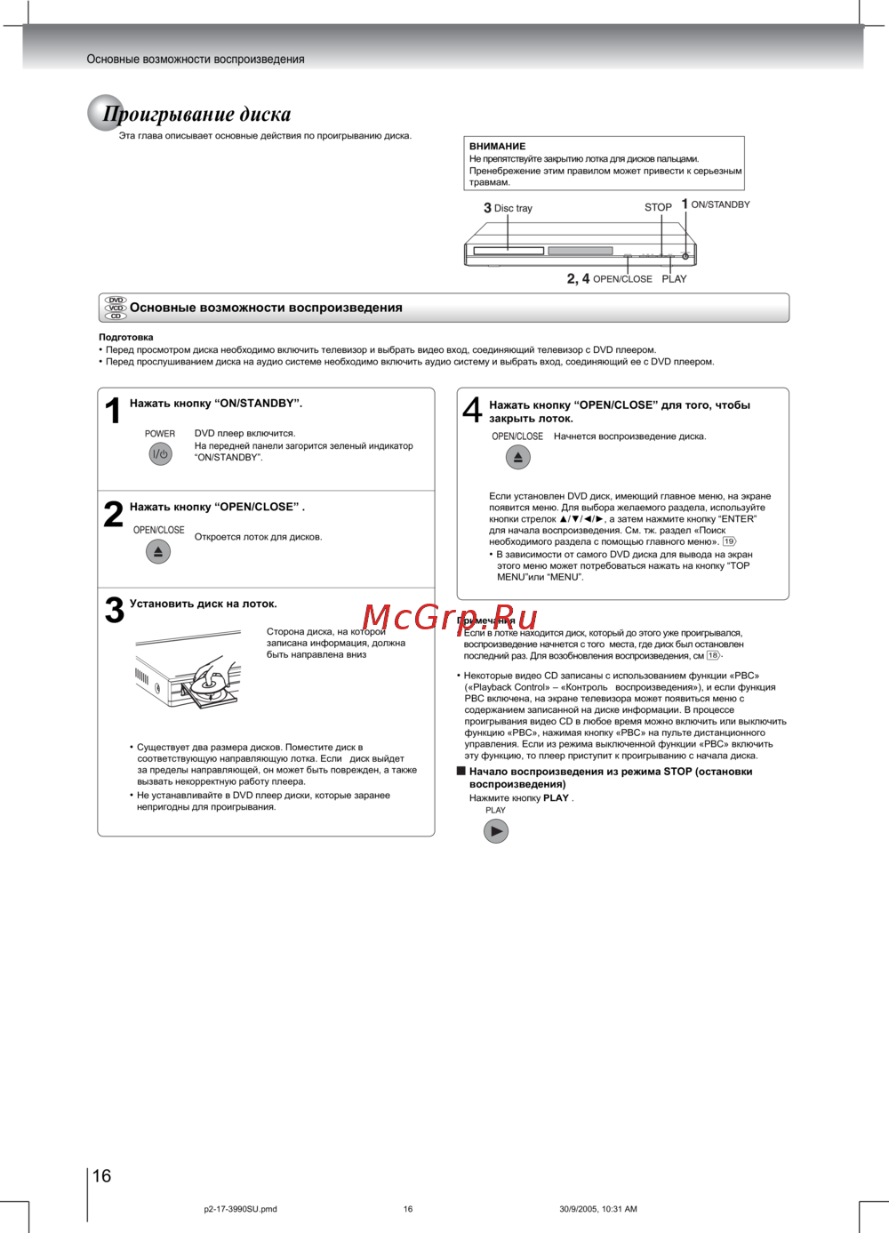 Основные возможности воспроизведения Проигрывание диска Эта глава описывает основные действия по проигрыванию диска ВНИМАНИЕ Не препятствуйте закрытию лотка для дисков пальцами Пренебрежение этим правилом может привести к серьезным травмам STOP 1 ON STANDBY 3 Disc tray 2 4 OPEN CLOSE PLAY Основные возможности воспроизведения Подготовка Перед просмотром диска необходимо включить телевизор и выбрать видео вход соединяющий телевизор с DVD плеером Перед прослушиванием диска на аудио системе необходимо включить аудио систему и выбрать вход соединяющий ее с DVD плеером Нажать кнопку ON STANDBY 4 POWER DVD плеер включится На передней панели загорится зеленый индикатор ON STANDBY OPEN CLOSE Начнется воспроизведение диска Если установлен DVD диск имеющий главное меню на экране появится меню Для выбора желаемого раздела используйте кнопки стрелок A V k а затем нажмите кнопку ENTER для начала воспроизведения См тж раздел Поиск необходимого раздела с помощью главного меню iio Нажать кнопку OPEN CLOSE OPEN CLOSE Нажать кнопку OPEN CLOSE для того чтобы закрыть лоток Откроется лоток для дисков В зависимости от самого DVD диска для вывода на экран этого меню может потребоваться нажать на кнопку ТОР MENU nnn MENU Установить диск на лоток Примечания Если в лотке находится диск юторый до этого уже проигрывался воспроизведение начнется с того места где диск был остановлен последний раз Для возобновления воспроизведения см is Сторона диска на которой записана информация должна быть направлена вниз Некоторые видео CD записаны с использованием функции РВС Playback Control Контроль воспроизведения и если функция РВС включена на экране телевизора может появиться меню с содержанием записанной на диске информации В процессе проигрывания видео CD в любое время можно включить или выключить функцию РВС нажимая кнопку РВС на пульте дистанционного управления Если из режима выключенной функции РВС включить эту функцию то плеер приступит к проигрыванию с начала диска Существует два размера дисков Поместите диск в соответствующую направляющую лотка Если диск выедет за пределы направляющей он может быть поврежден а также вызвать некорректную работу плеера Начало воспроизведения из режима STOP остановки воспроизведения Не устанавливайте в DVD плеер диски которые заранее непригодны для проигрывания Нажмите кнопку PLAY PLAY 16 p2 17 3990SU pmd 16 30 9 2005 10 31 AM