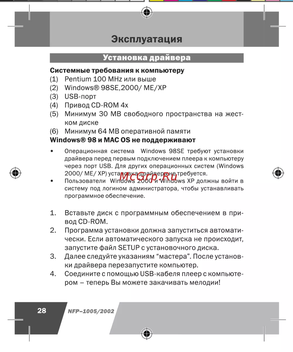 Эксплуатация Установка драйвера Системные требования к компьютеру 1 2 3 4 5 Pentium 100 MHz или выше Windows 98SE 2000 МЕ ХР USB порт Привод CD ROM 4х Минимум 30 МВ свободного пространства ком диске 6 Минимум 64 МВ оперативной памяти на жест Windows 98 и MAC OS не поддерживают Операционная система Windows 98SE требуют установки драйвера перед первым подключением плеера к компьютеру через порт USB Для других операционных систем Windows 2000 ME ХР установка драйвера не требуется Пользователи Windows 2000 и Windows ХР должны войти в систему под логином администратора чтобы устанавливать программное обеспечение 1 Вставьте диск с программным обеспечением в при вод CD ROM 2 Программа установки должна запуститься автомати чески Если автоматического запуска не происходит запустите файл SETUP с установочного диска 3 Далее следуйте указаниям мастера После установ ки драйвера перезапустите компьютер 4 Соедините с помощью USB кабеля плеер с компьюте ром теперь Вы можете закачивать мелодии NFP 1005 2002