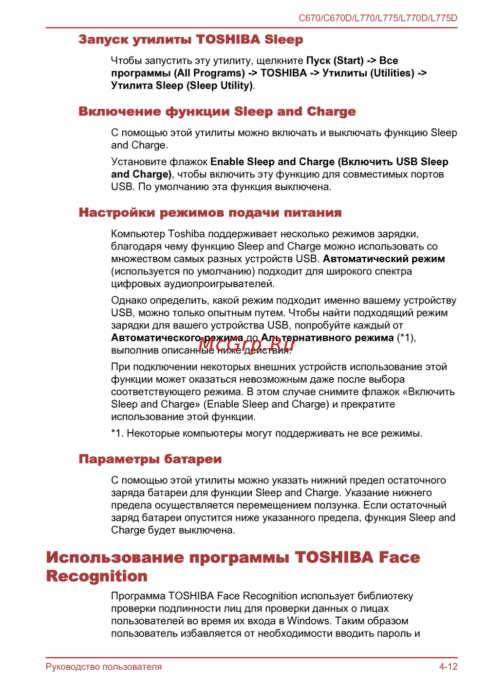 Компьютер Toshiba поддерживает несколько режимов зарядки,