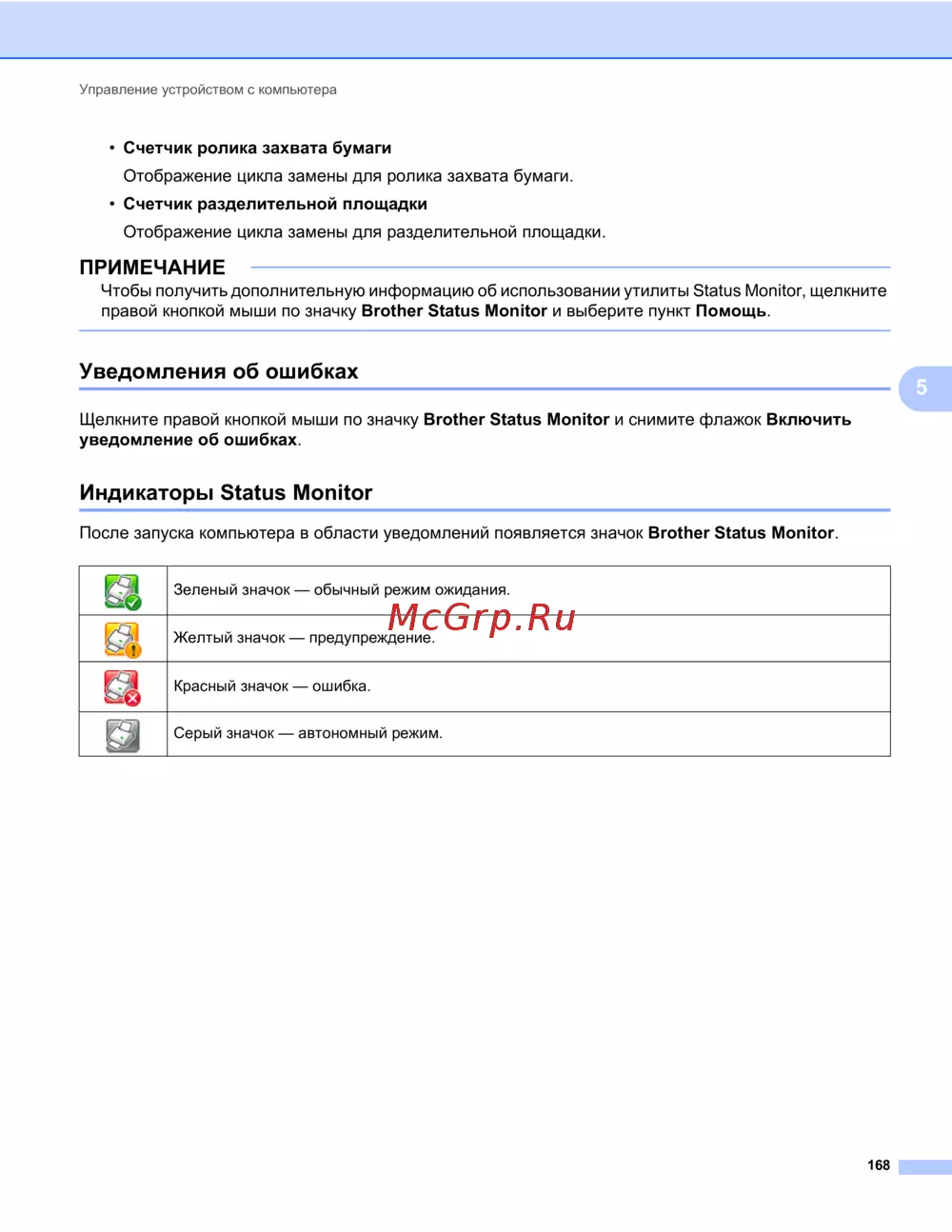 После запуска компьютера в области уведомлений появляется значок Brother Status Monitor.