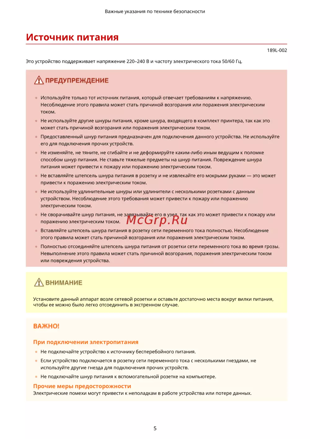 ● Не используйте другие шнуры питания, кроме шнура, входящего в комплект принтера, так как это