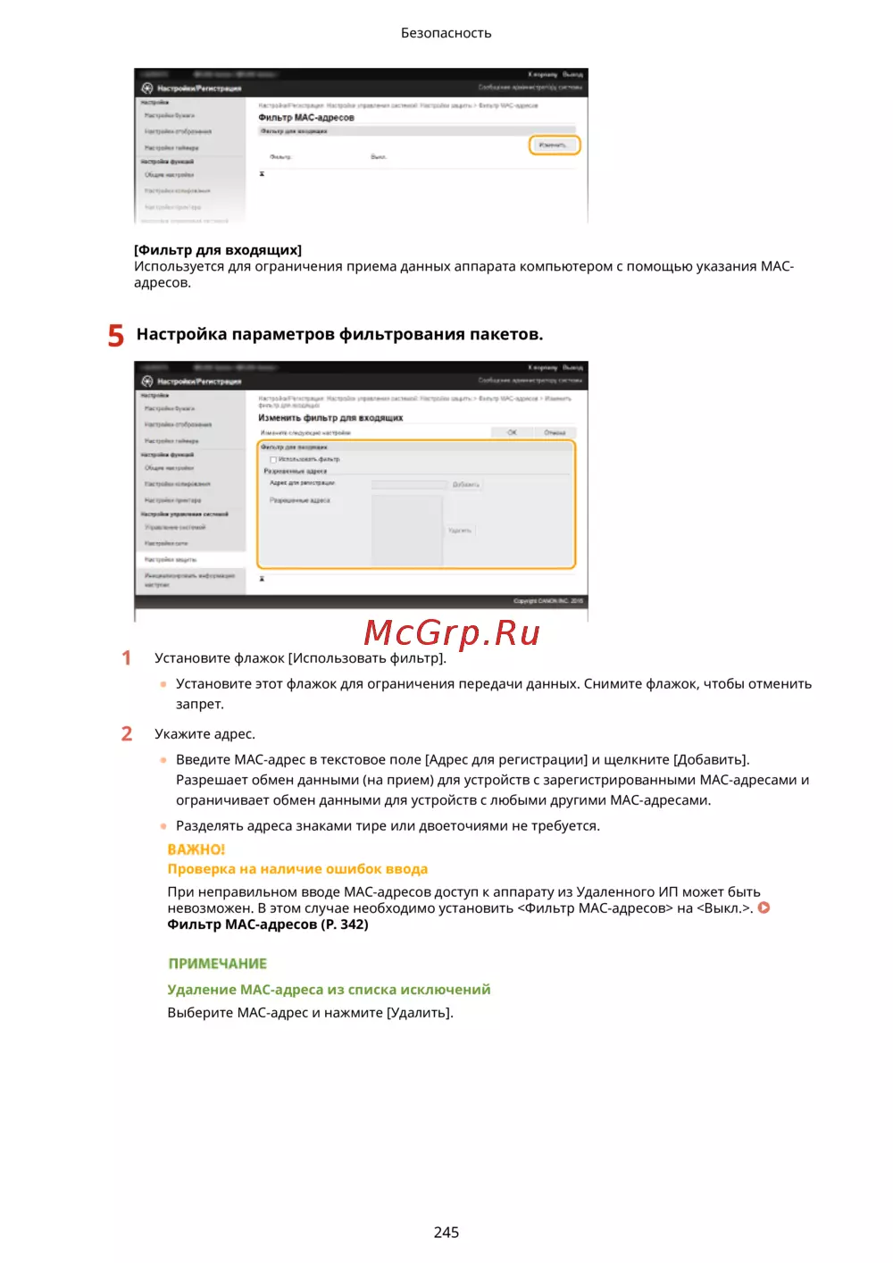 Canon MF232w — настройка фильтрации MAC-адресов для ограничения доступа [251/488]