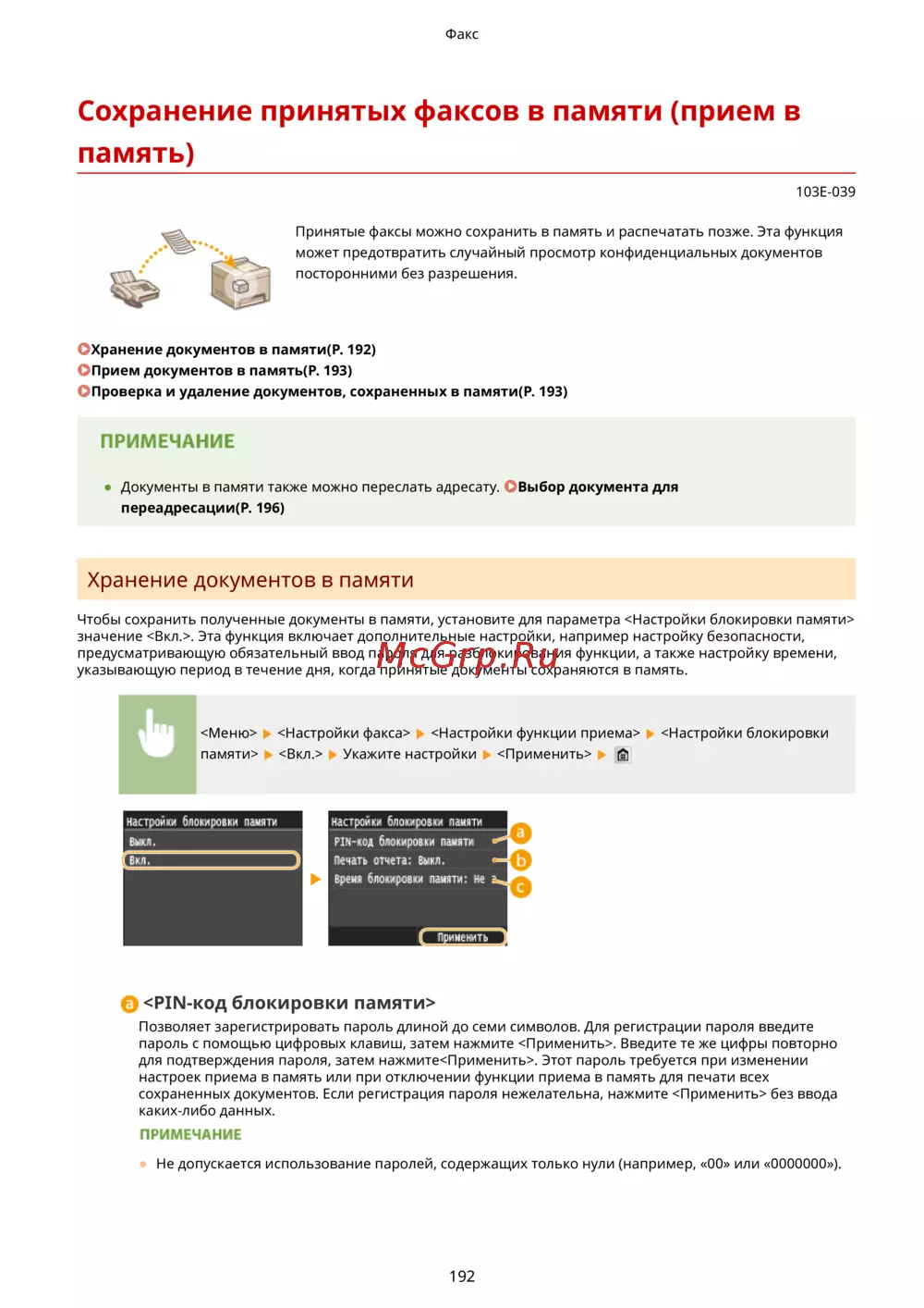 Чтобы сохранить полученные документы в памяти, установите для параметра <Настройки блокировки памяти>