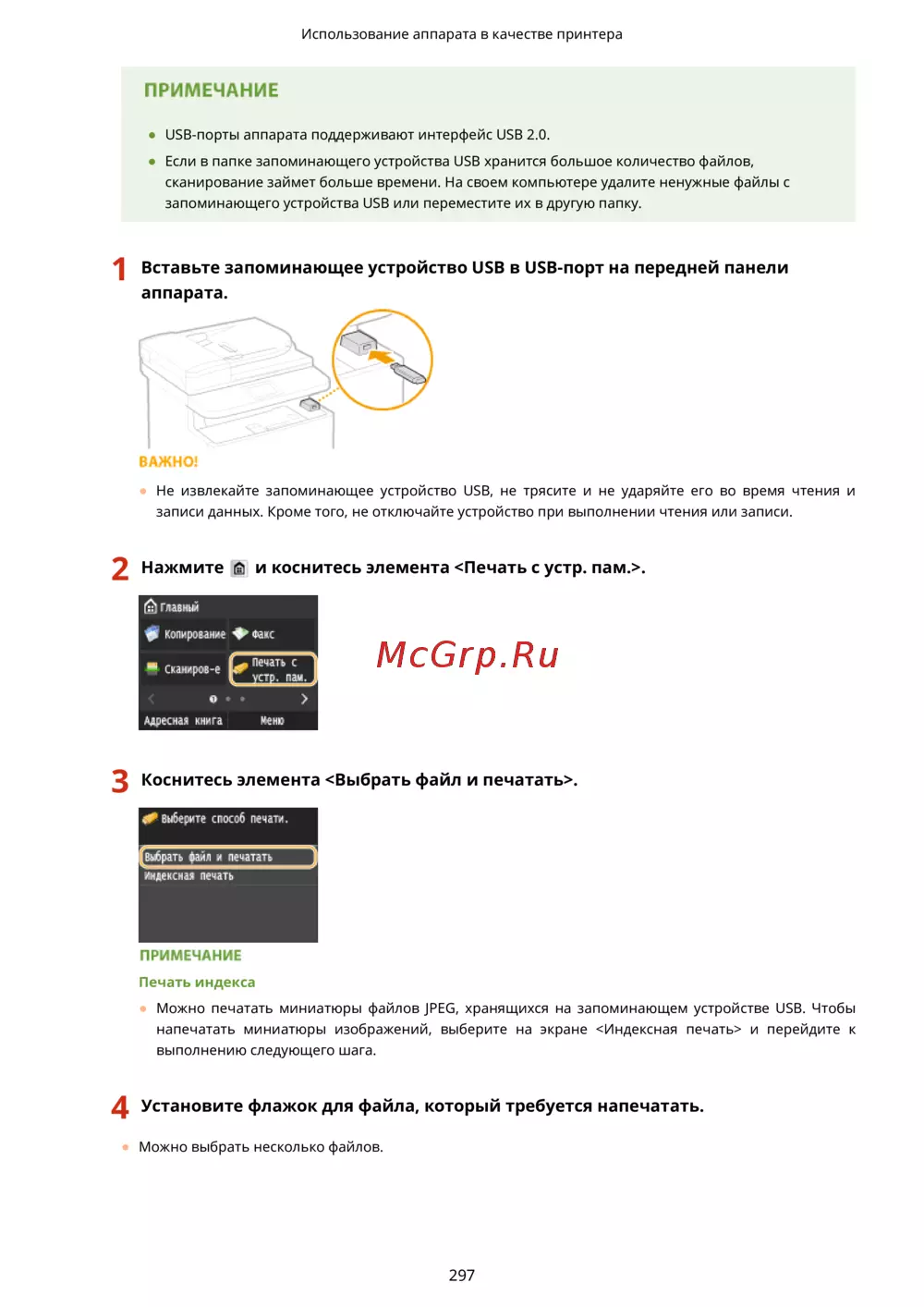 ● Можно печатать миниатюры файлов JPEG, хранящихся на запоминающем устройстве USB. Чтобы