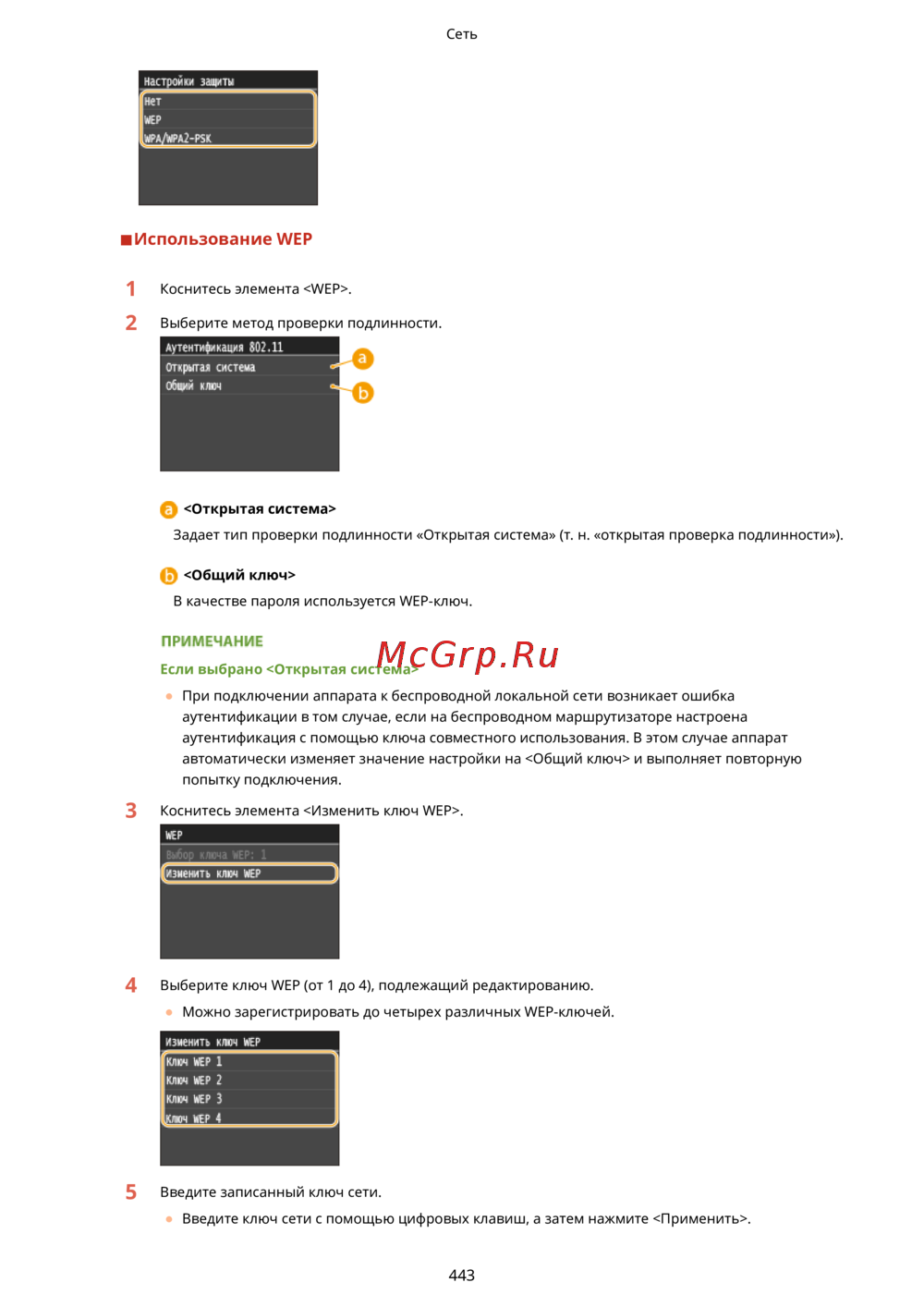 ● Можно зарегистрировать до четырех различных WEP-ключей.