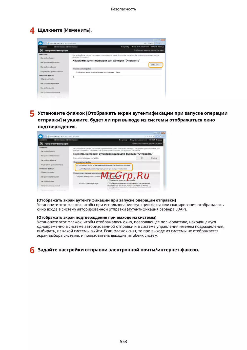 Узнайте, как настроить экран аутентификации и подтверждения при выходе из системы. Оптимизируйте отправку факсов и электронной почты с помощью простых шагов.
