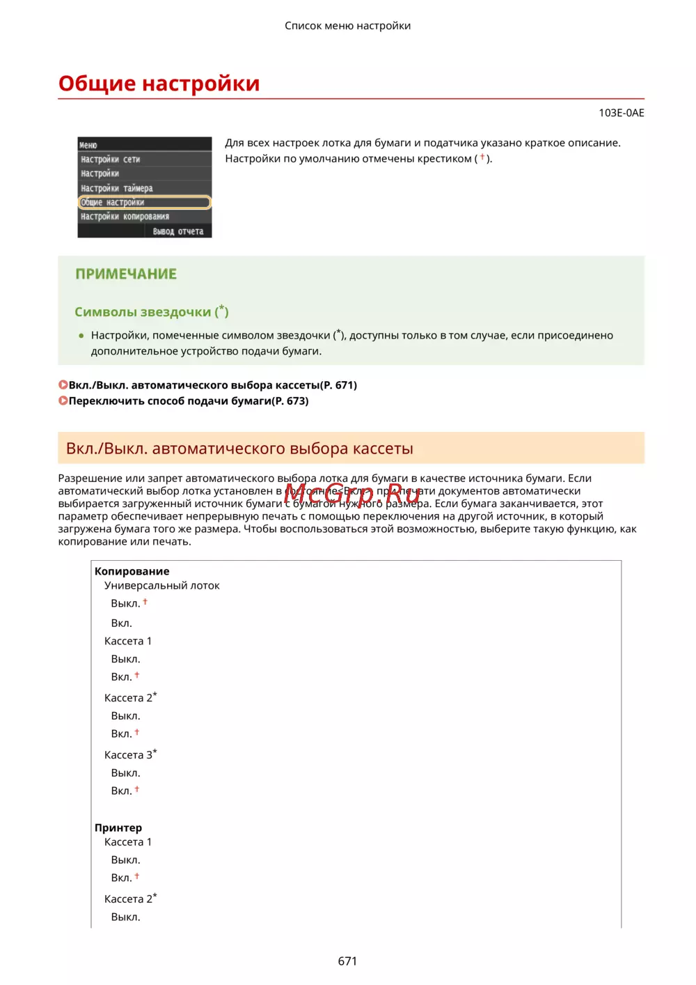 Вкл./Выкл. автоматического выбора кассеты(P. 671)
