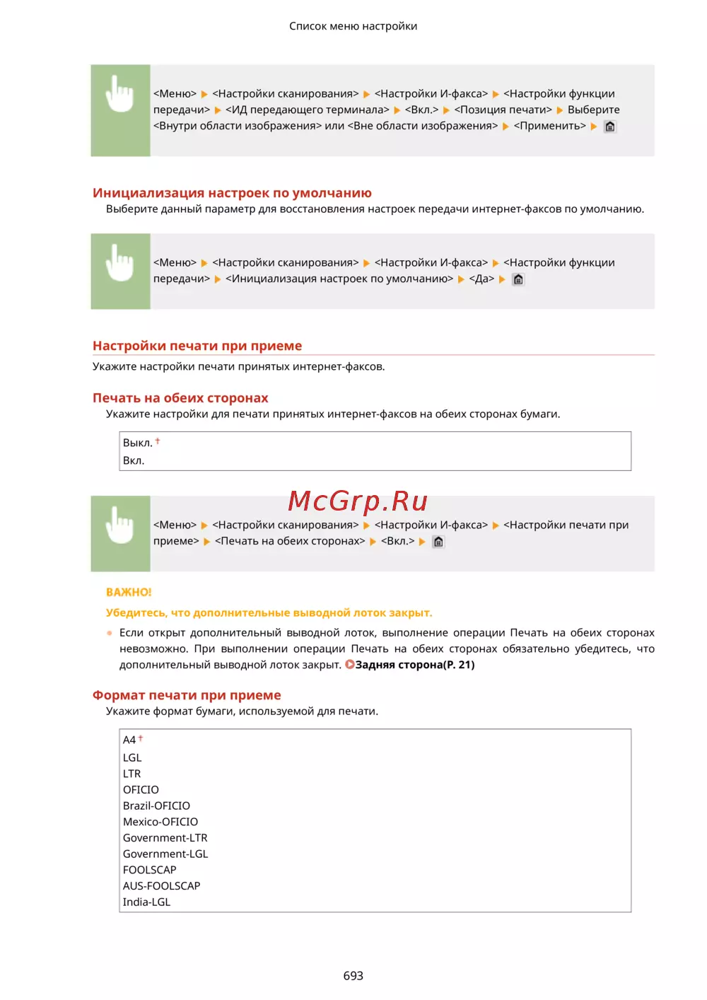 <Меню> <Настройки сканирования> <Настройки И-факса> <Настройки печати при