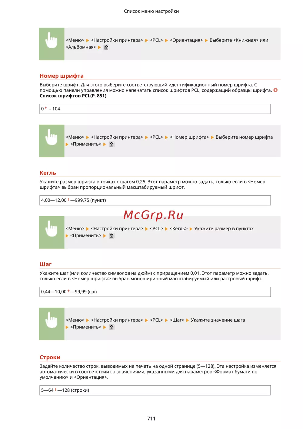 <Меню> <Настройки принтера> <PCL> <Шаг> Укажите значение шага