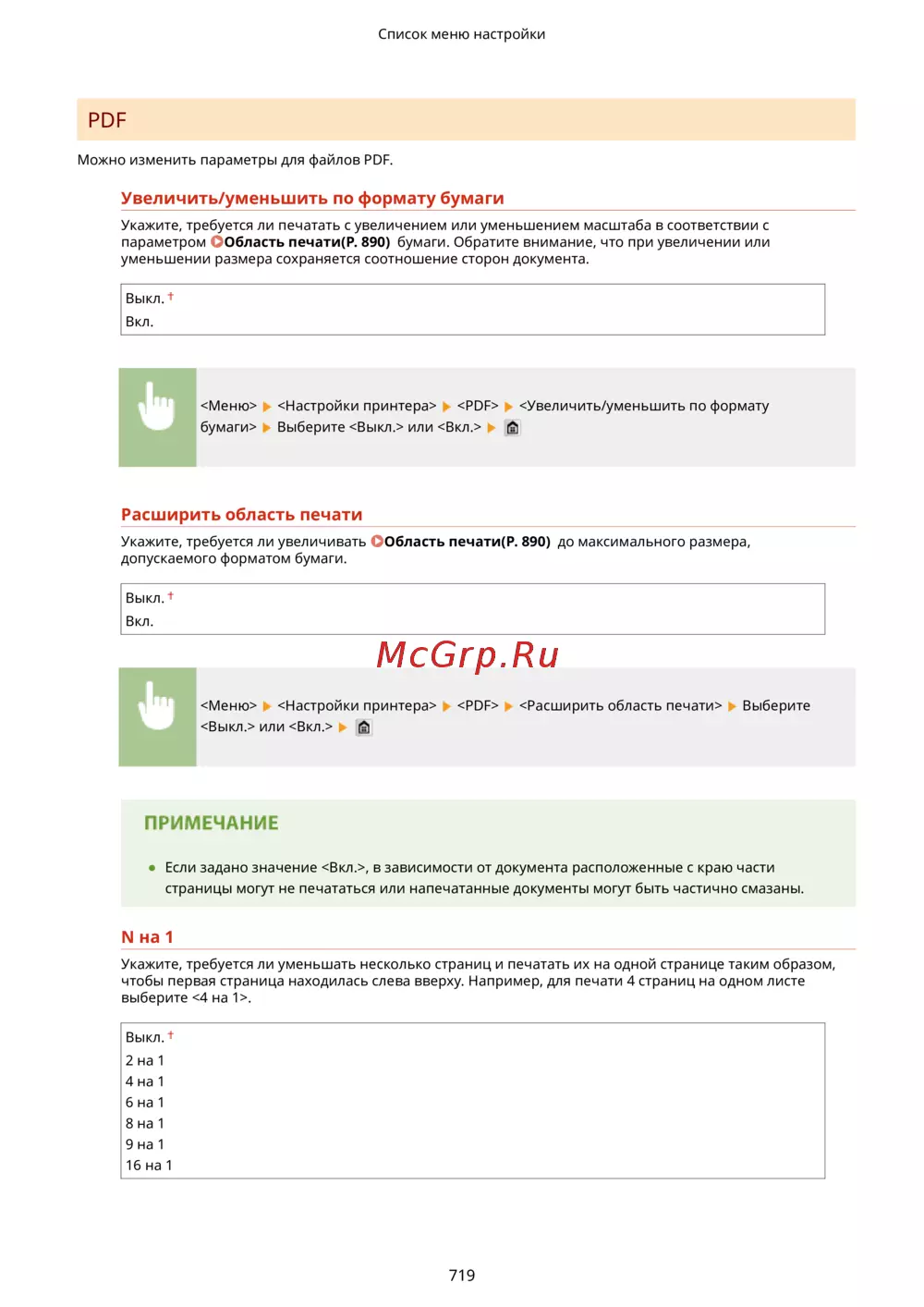 <Меню> <Настройки принтера> <PDF> <Расширить область печати> Выберите