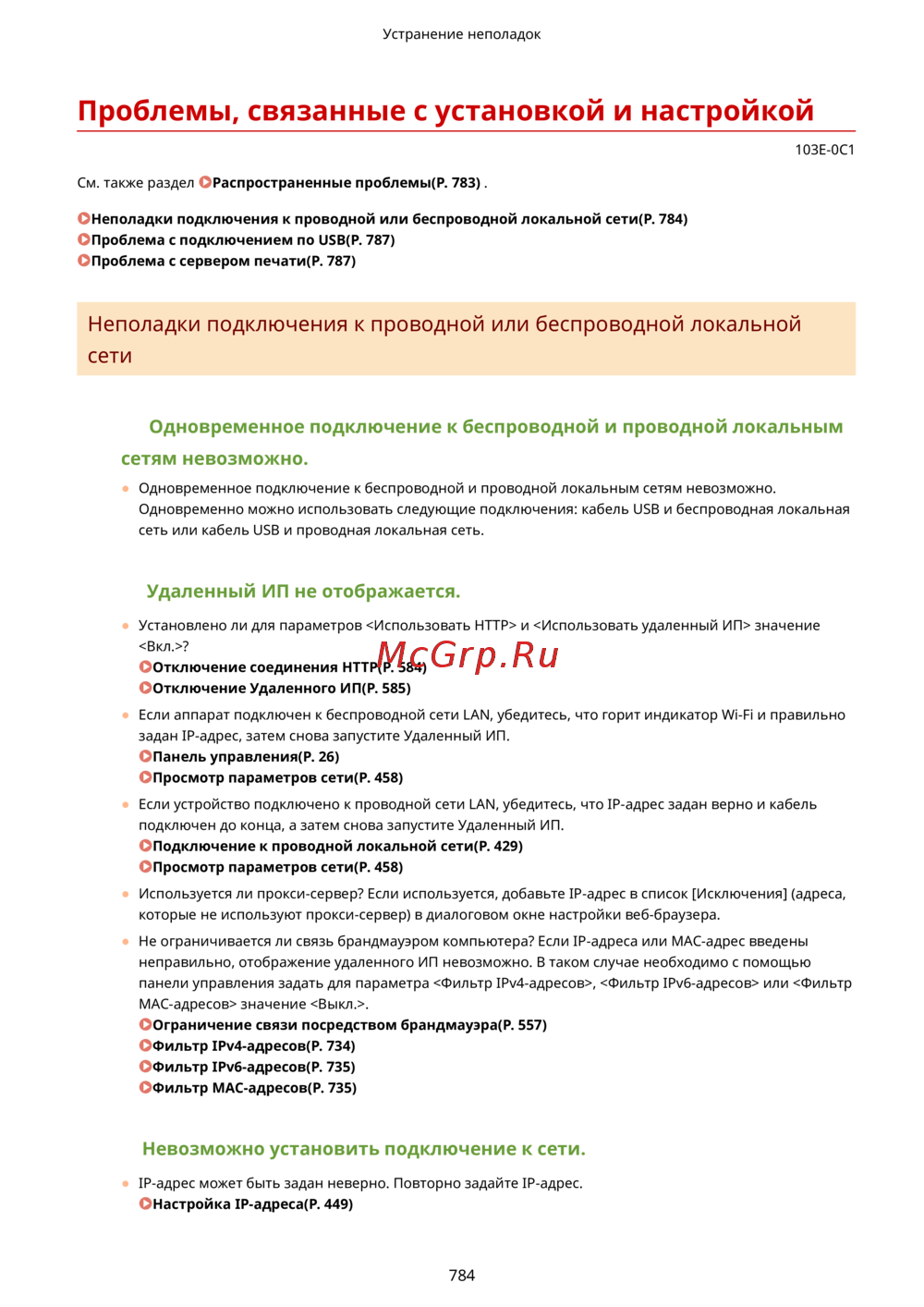 Неполадки подключения к проводной или беспроводной локальной сети(P. 784)
