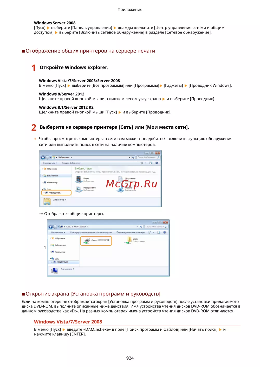- Выберите на сервере принтера сеть или мои места сети p.934