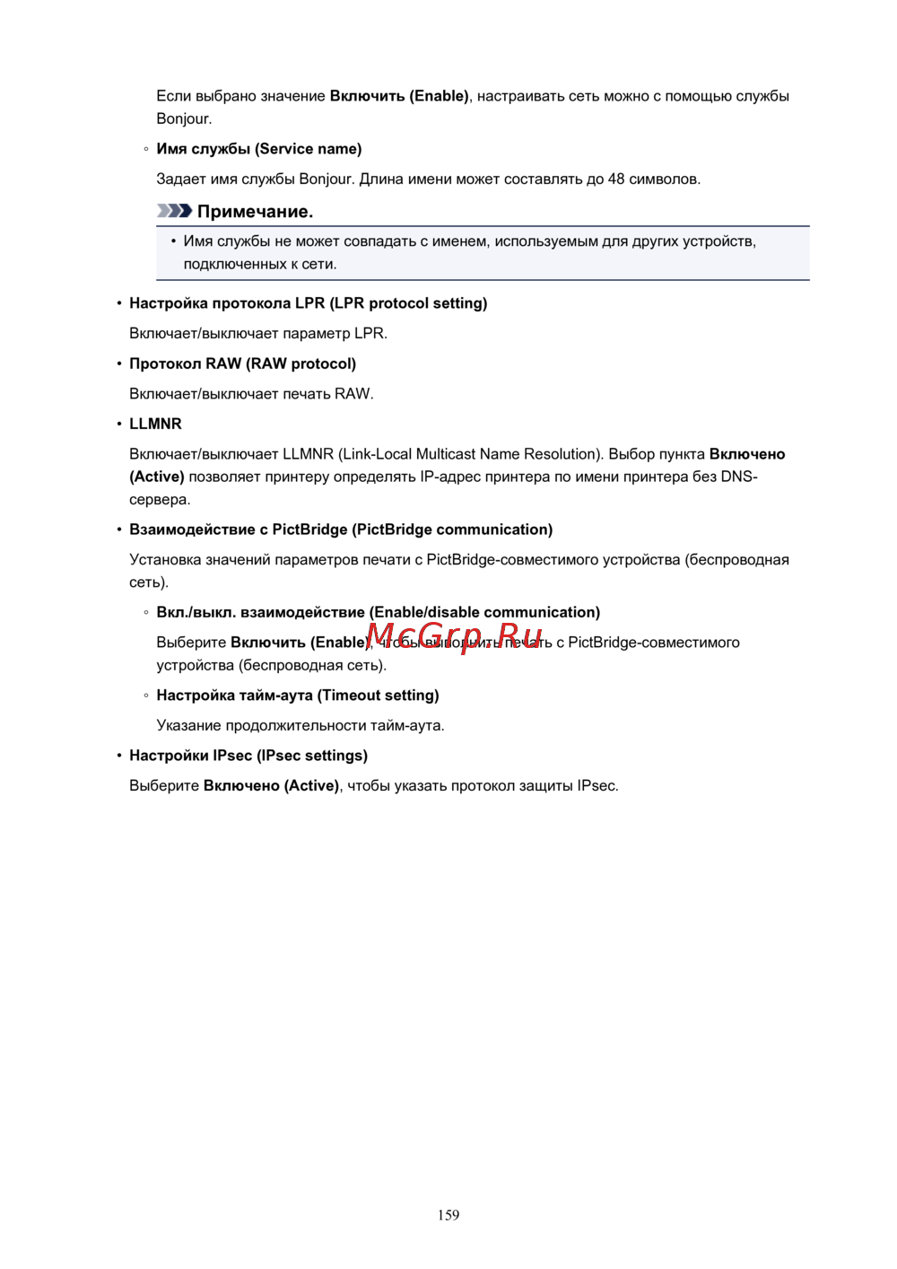 Узнайте, как настроить сеть с помощью Bonjour, включая параметры LPR, RAW, LLMNR и PictBridge для оптимизации печати и взаимодействия с устройствами.