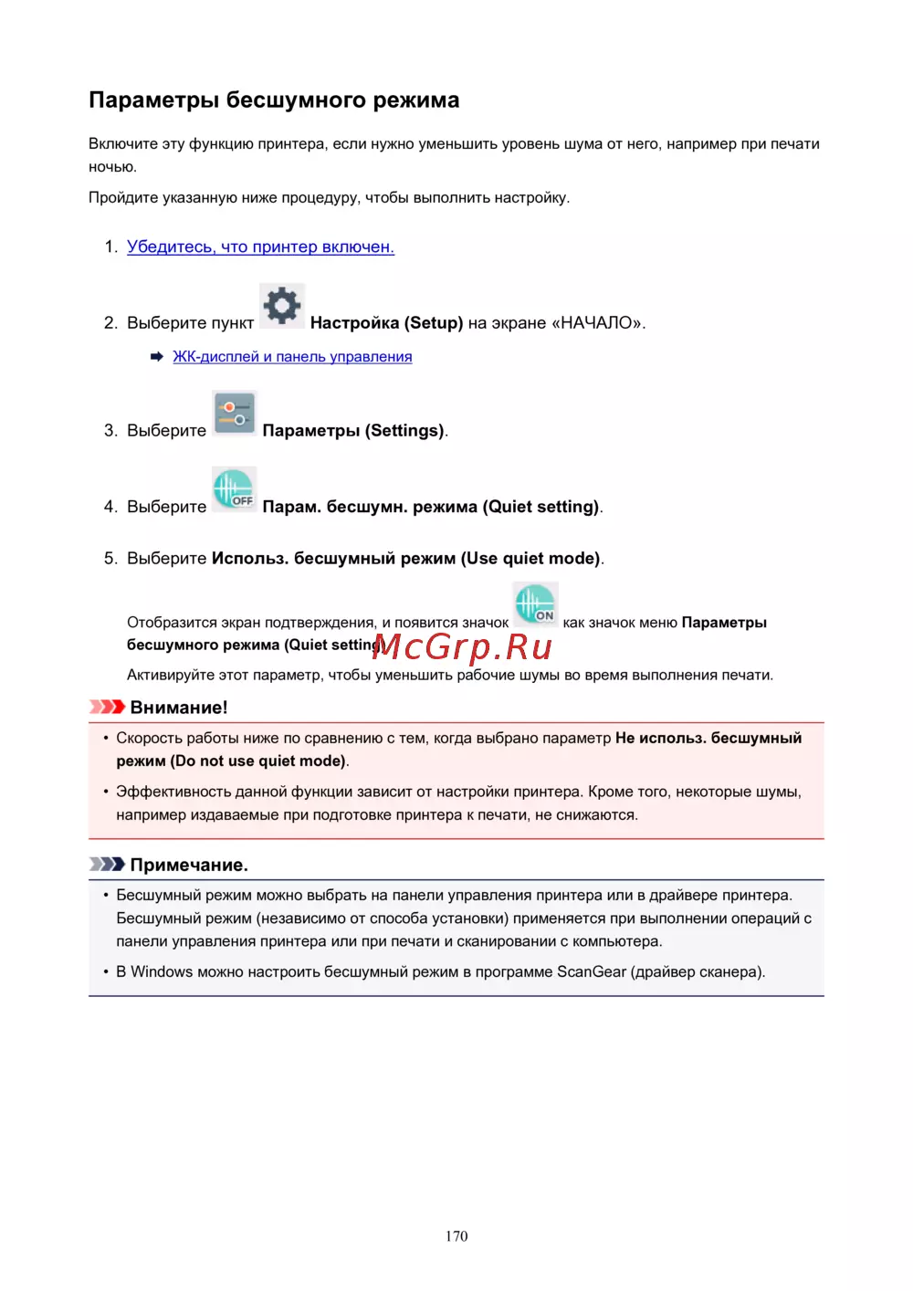 • В Windows можно настроить бесшумный режим в программе ScanGear (драйвер сканера).