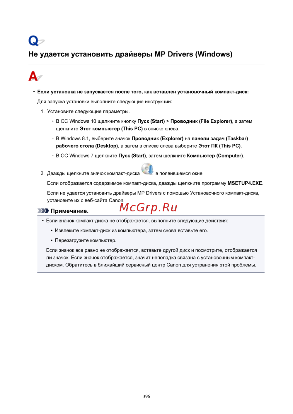 Если не удается установить драйверы MP Drivers с помощью Установочного компакт-диска,