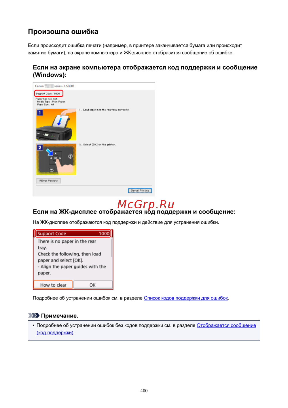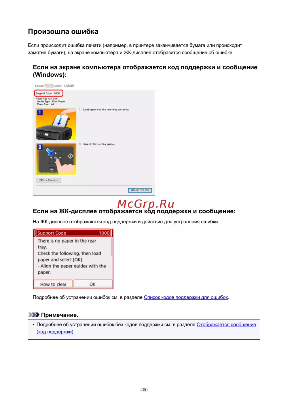 замятие бумаги), на экране компьютера и ЖК-дисплее отобразится сообщение об ошибке.