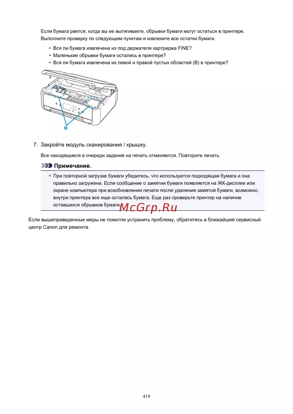 - Убедитесь в отсутствии замятой бумаги под держателем картриджа fine p.417