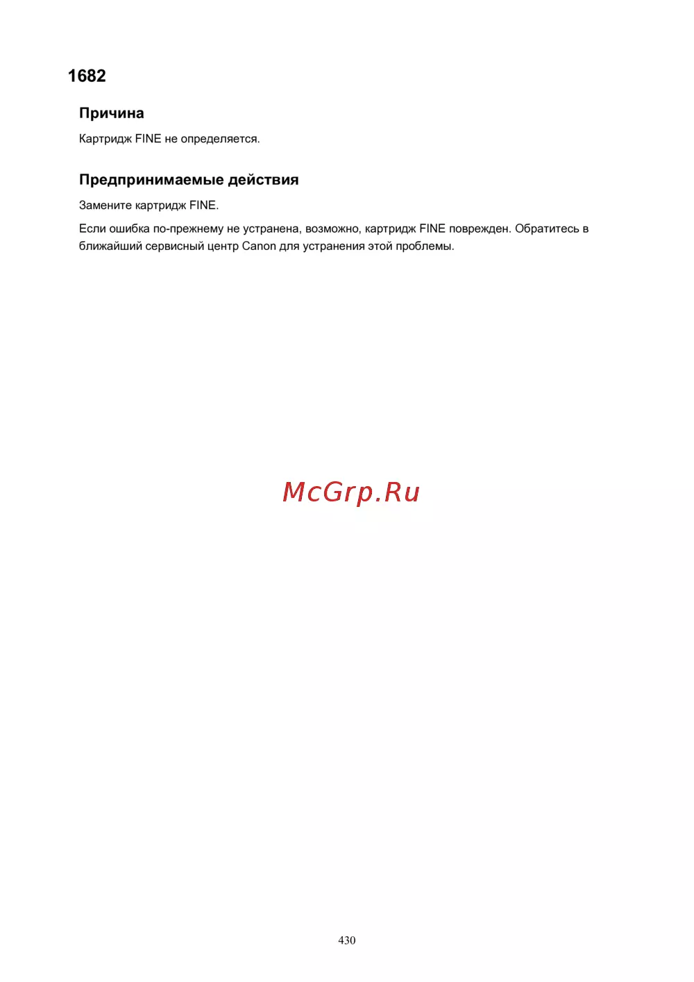Если ошибка по-прежнему не устранена, возможно, картридж FINE поврежден. Обратитесь в