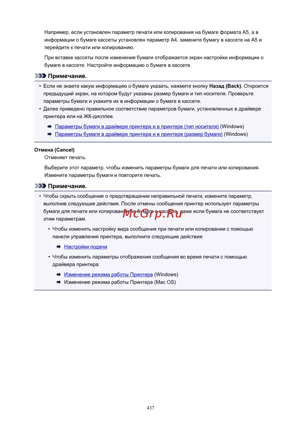 выполнив следующие действия. После отмены сообщения принтер использует параметры