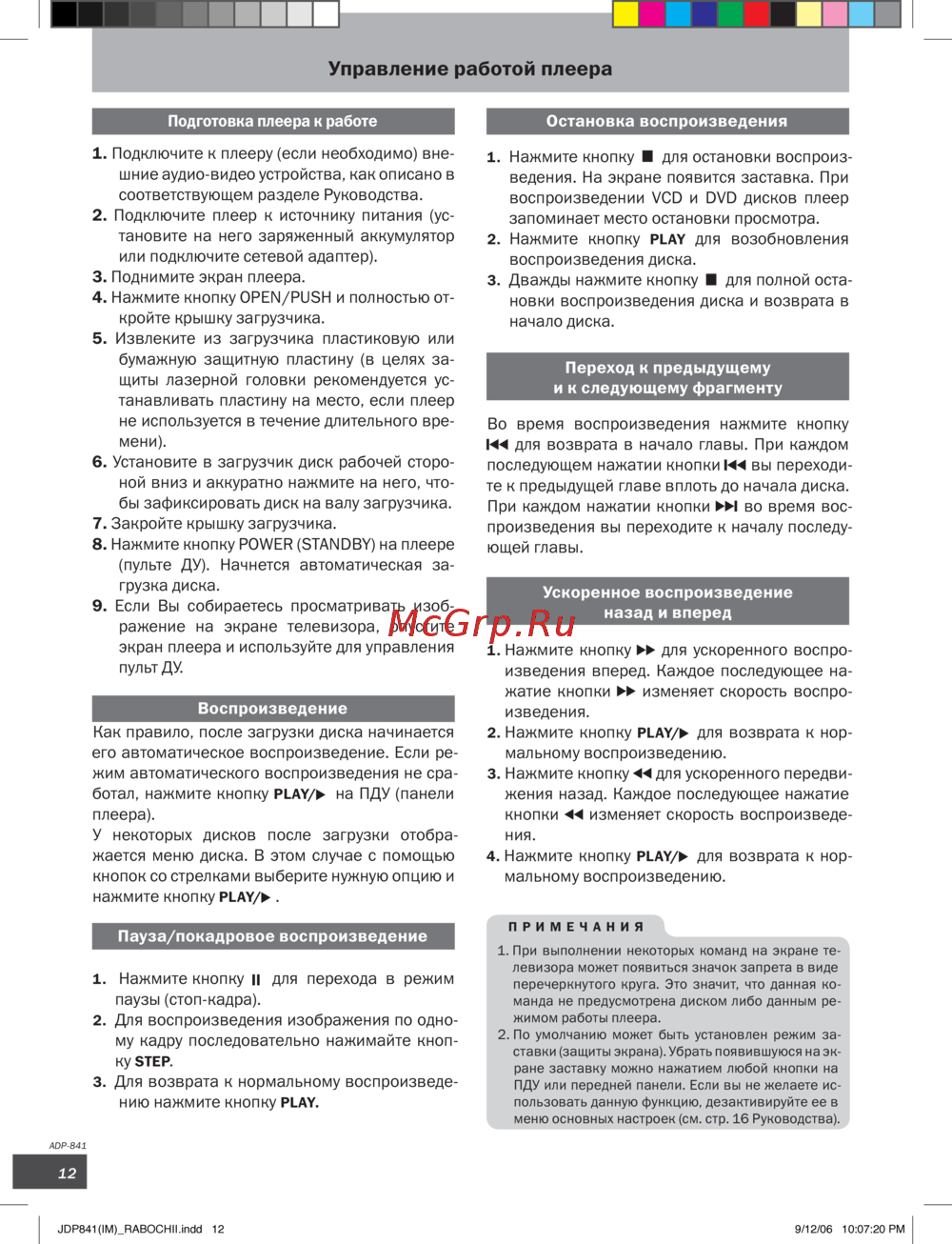 - Множество участков для проигрывания диска пользователь может выбирать любую главу или раз дел для начала проигрывания диска p.6