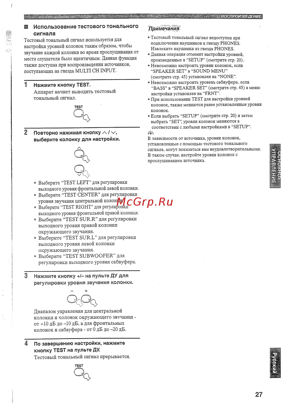 В Использование тестового тонального сигнала Тестовый тональный сигнал используется для настройки уровней колонок таким образом чтобы звучание каждой колонки во время прослушивания от места слушателя было идентичным Данная функция также доступна при воспроизведении источников поступающих на гнезда MULTI CH INPUT 1 Нажмите кнопку TEST Аппарат начнет выводить тестовый тональный сигнал TEST 2 Повторно нажимая кнопку выберите колонку для настройки Примечания Тестовый тональный сигнал недоступен при подключении наушников к гнезду PHONES Извлеките наушники из гнезда PHONES Данная операция отменит настройки уровней произведенные в SETUP смотрите стр 20 0 Невозможно настроить уровни колонок если SPEAKER SET в SOUND MENU смотрите стр 45 установлен на NONE 0 Невозможно настроить уровень сабвуфера если BASS в SPEAKER SET смотрите стр 45 в меню настройки установлен на FRNT 0 При использовании TEST для настройки уровней колонок также меняются ранее установленные уровни колонок Если выбрать SETUP смотрите стр 20 и затем выбрать SET уровни колонок меняются в соответствии с любыми настройками в SETUP г ф с В зависимости от источника уровни колонок установленные с помощью тестового тонального сигнала могут показаться вам неудовлетворительными В таком случае настройте уровни колонок с прослушиванием источника в Выберите TEST LEFT для регулировки выходного уровня фронтальной левой колонки Выберите TEST CENTER для регулировки уровня звучания центральной колонки Выберите TEST RIGHT для регулировки выходного уровня фронтальной правой колонки Выберите TEST SUR R для регулировки выходного уровня правой колонки окружающего звучания Выберите TEST SUR L для регулировки выходного уровня левой колонки окружающего звучания Выберите TEST SUBWOOFER для регулировки выходного уровня сабвуфера 3 Нажмите кнопку на пульте ДУ для регулировки уровня звучания колонки Диапазон управления для центральной колонки и колонок окружающего звучания от ьЮ дБ до 10 дБ а для фронтальных колонок и сабвуфера от 0 дБ до 20 дБ Русский 4 По завершению настройки нажмите кнопку TEST на пульте ДУ Тестовый тональный сигнал прерывается TEST 27