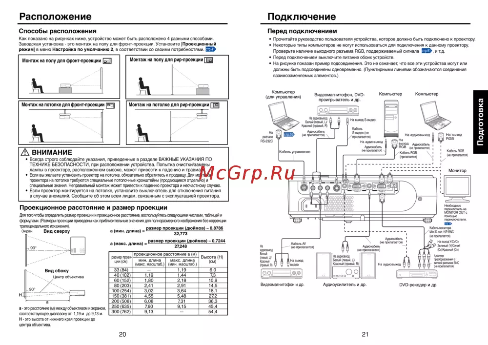 Для того чтобы определить размер проекции и проекционное расстояние, воспользуйтесь следующими числами, таблицей и