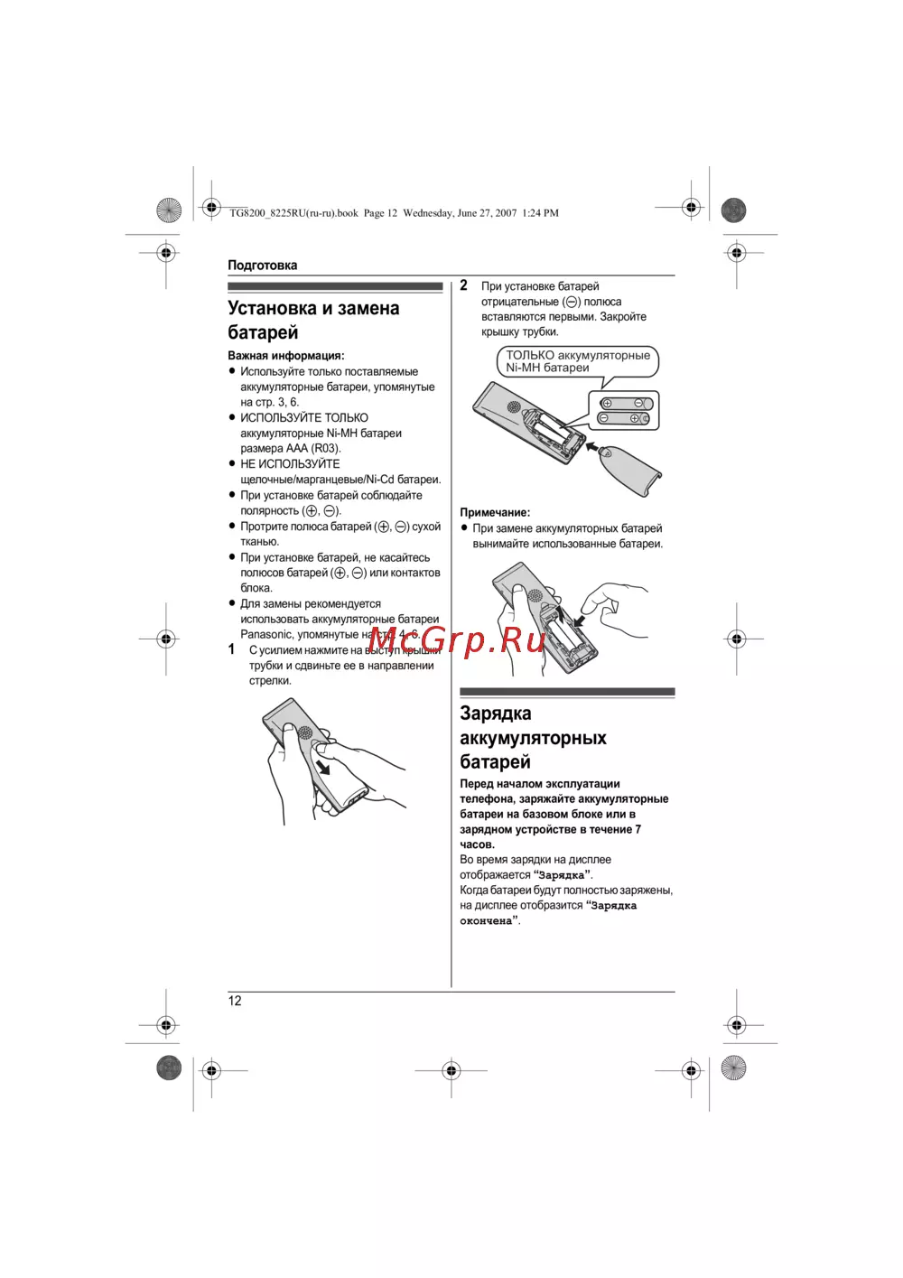 Panasonic KX-TG8226 RU-M — установка и замена аккумуляторных батарей: важные советы [12/64]