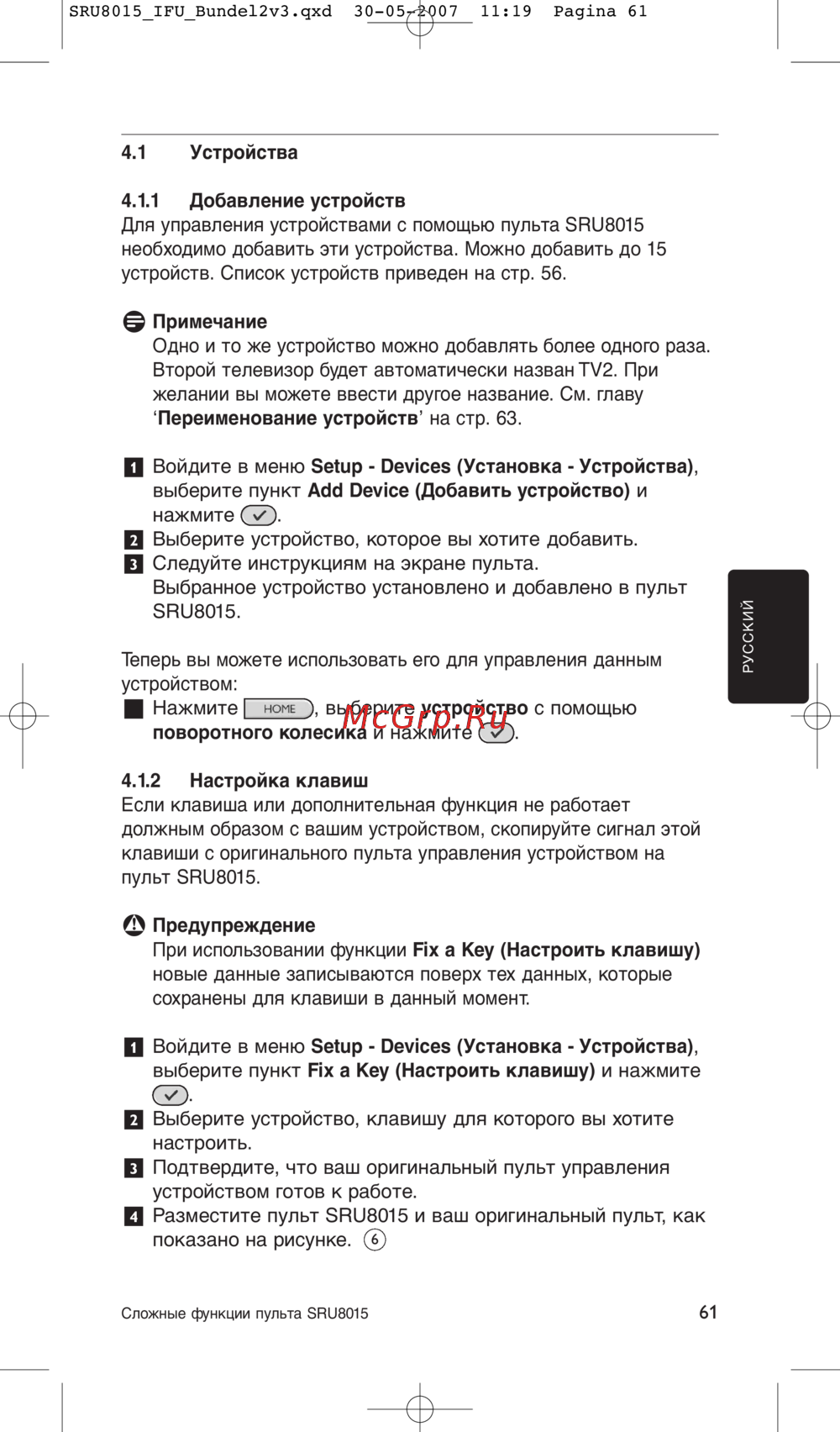 - Добавьте устройства следуя инструкциям на дисплее пульта вы можете добавить любое устройство из следующего списка p.6