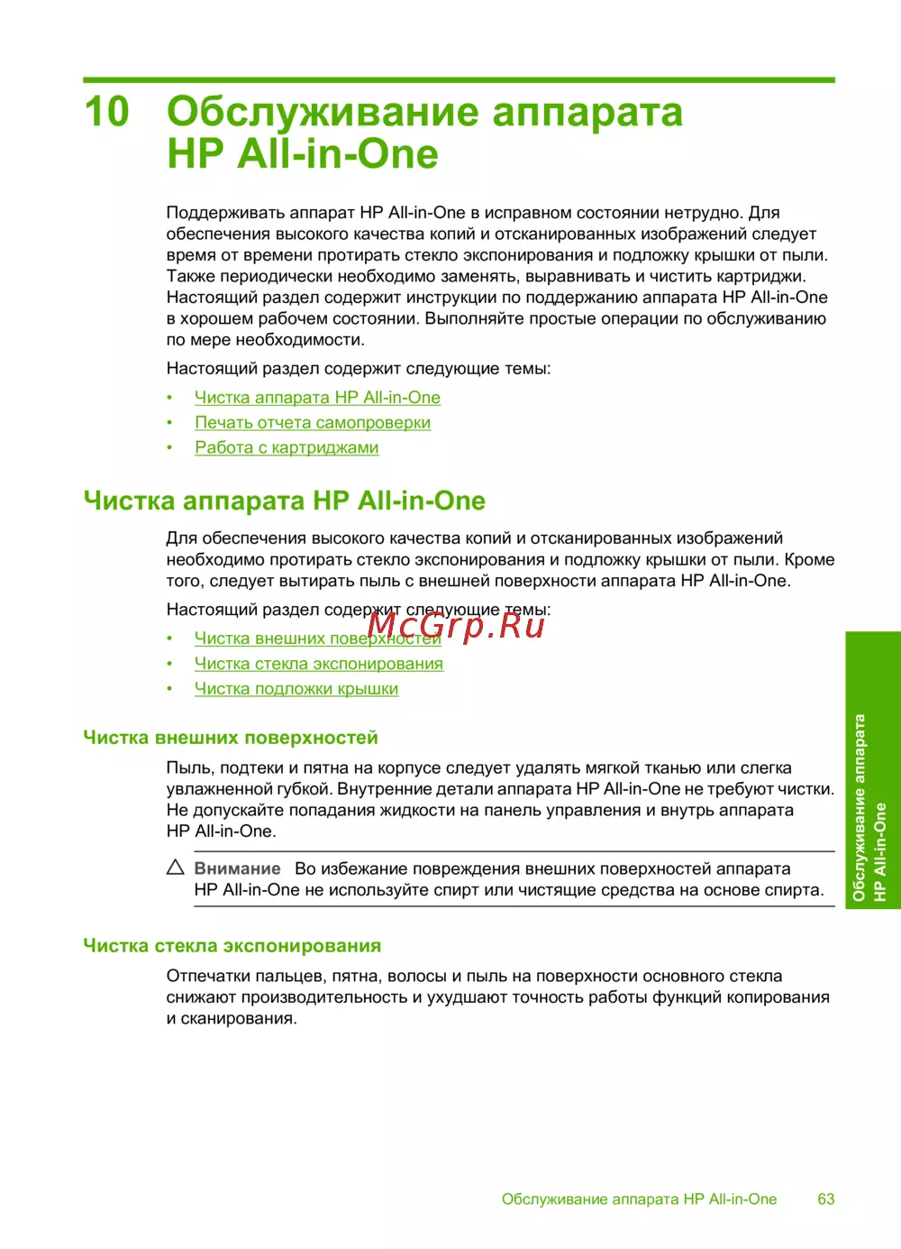 увлажненной губкой. Внутренние детали аппарата HP All-in-One не требуют чистки.