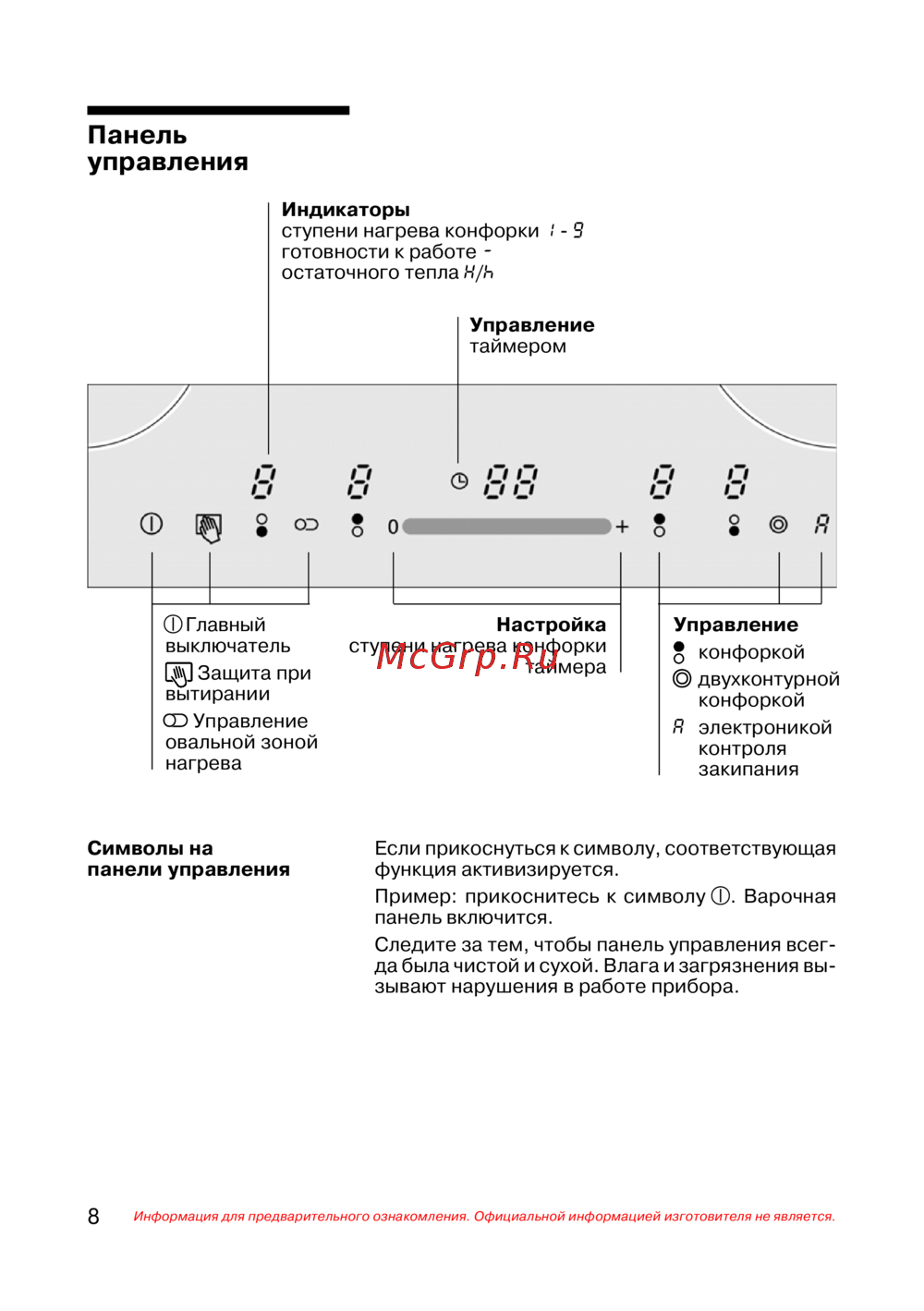 - Выключение конфорки выберите конфорку и установите ступень нагре ва на 0 конфорка выключается и примерно через 5 се кунд включается индикатор остаточного тепла p.14