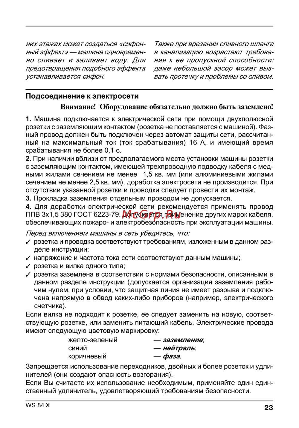 них этажах може т создаться сифон ный эффект машина одновремен но сливает и заливает воду Для предотвращения подобного эффекта устанавливается сифон Также при врезании сливного шланга в канализацию возрастают требова ния к ее пропускной способности даже небольшой засор может выз вать протечку и проблемы со сливом Подсоединение к электросети Внимание Оборудование обязательно должно быть заземлено 1 Машина подключается к электрической сети при помощи двухполюсной розетки с заземляющим контактом розетка не поставляется с машиной Фаз ный провод должен быть подключен через автомат защиты сети рассчитан ный на максимальный ток ток срабатывания 16 А и имеющий время срабатывания не более 0 1 с 2 При наличии вблизи от предполагаемого места установки машины розетки с заземляющим контактом имеющей трехпроводную подводку кабеля с мед ными жилами сечением не менее 1 5 кв мм или алюминиевыми жилами сечением не менее 2 5 кв мм доработка электросети не производится При отсутствии указанной розетки и проводки следует провести их монтаж 3 Прокладка заземления отдельным проводом не допускается 4 Для доработки электрической сети рекомендуется применять провод ППВ 3x1 5 380 ГОСТ 6223 79 Допускается применение других марок кабеля обеспечивающих пожаро и электробезопасность при эксплуатации машины Перед включением машины в сеть убедитесь что розетка и проводка соответствуют требованиям изложенным в данном раз деле инструкции напряжение и частота тока сети соответствуют данным машины розетка и вилка одного типа розетка заземлена в соответствии с нормами безопасности описанными в данном разделе инструкции допускается организация заземления рабо чим нулем при условии что защитная линия не имеет разрыва и подклю чена напрямую в обвод каких либо приборов например электрического счетчика Если вилка не подходит к розетке ее следует заменить на новую соответ ствующую розетке или заменить питающий кабель Электрические провода имеют следующую цветовую маркировку желто зеленый заземление синий нейтраль коричневый фаза Запрещается использование переходников двойных и более розеток и удли нителей они создают опасность возгорания Если Вы считаете их использование необходимым применяйте один един ственный удлинитель удовлетворяющий требованиям безопасности WS 84 X 23