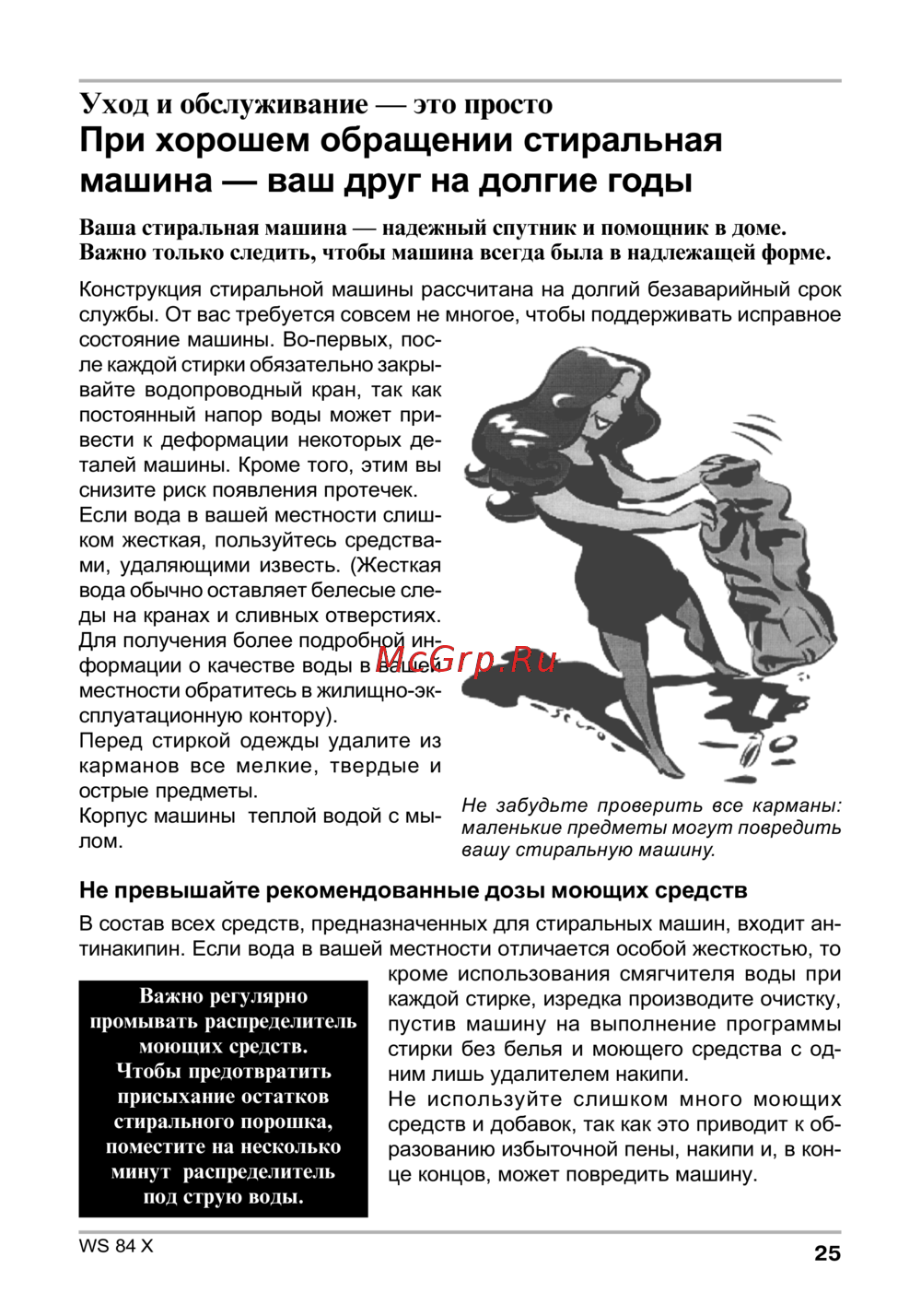 Уход и обслуживание это просто При хорошем обращении стиральная машина ваш друг на долгие годы Ваша стиральная машина падежный спутник и помощник в доме Важно только следить чтобы машина всегда была в надлежащей форме Конструкция стиральной машины рассчитана на долгий безаварийный срок службы От вас требуется совсем не многое чтобы поддерживать исправное состояние машины Во первых пос ле каждой стирки обязательно закры вайте водопроводный кран так как постоянный напор воды может при вести к деформации некоторых де талей машины Кроме того этим вы снизите риск появления протечек Если вода в вашей местности слиш ком жесткая пользуйтесь средства ми удаляющими известь Жесткая вода обычно оставляет белесые сле ды на кранах и сливных отверстиях Для получения более подробной ин формации о качестве воды в вашей местности обратитесь в жилищно эк сплуатационную контору Перед стиркой одежды удалите из карманов все мелкие твердые и острые предметы Не забудьте проверить все карманы Корпус машины теплой водой с мы маленькие предметы могут повредить лом вашу стиральную машину Не превышайте рекомендованные дозы моющих средств В состав всех средств предназначенных для стиральных машин входит антинакипин Если вода в вашей местности отличается особой жесткостью то кроме использования смягчителя воды при Важно регулярно каждой стирке изредка производите очистку промывать распределитель пустив машину на выполнение программы моющих средств стирки без белья и моющего средства с од Чтобы предотвратить ним лишь удалителем накипи присыхание остатков Не используйте слишком много моющих стирального порошка средств и добавок так как это приводит к об поместите на несколько разованию избыточной пены накипи и в кон минут распредел тель це концов может повредить машину под струю воды WS 84 X 25