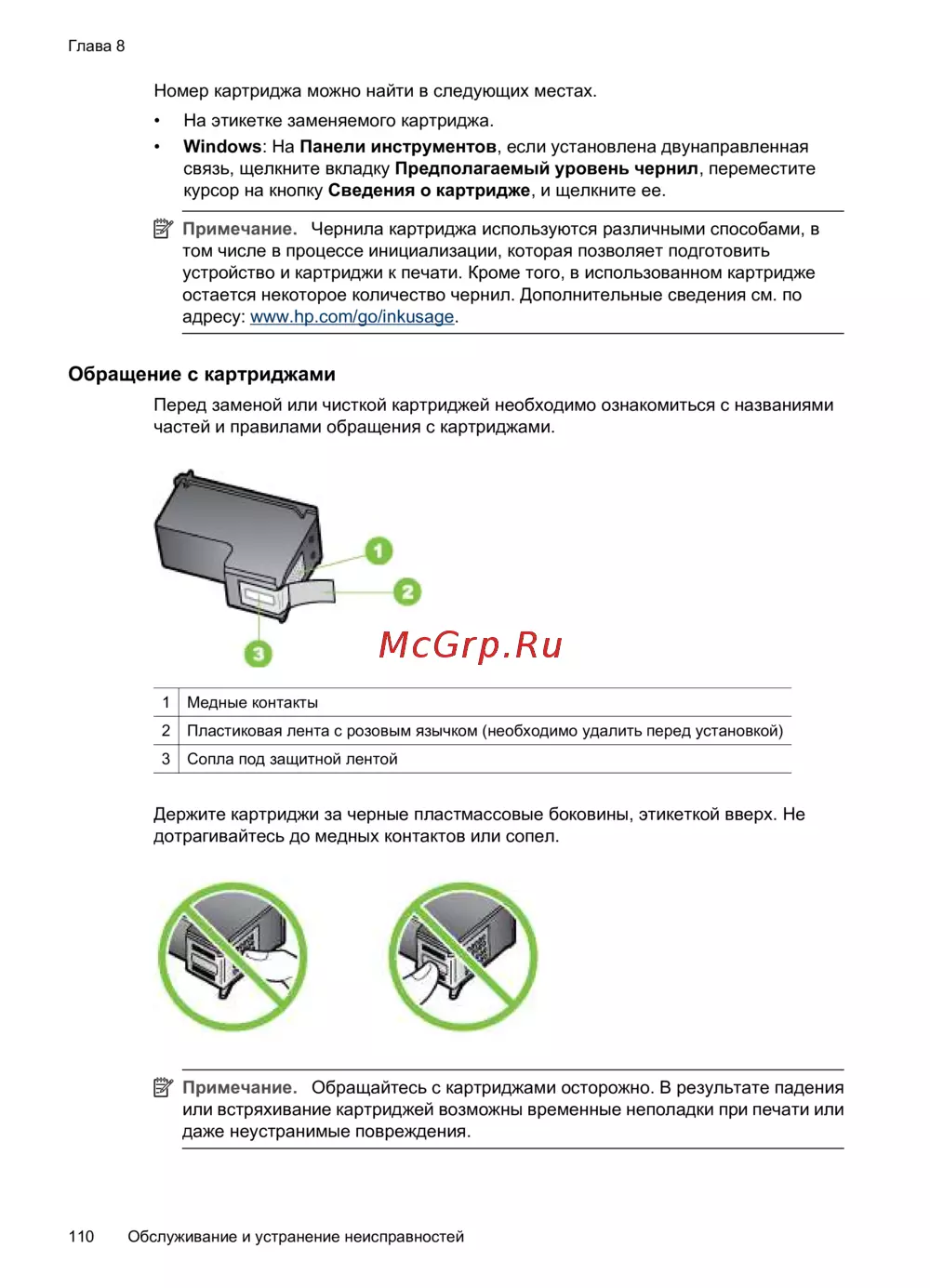 Примечание. Обращайтесь с картриджами осторожно. В результате падения