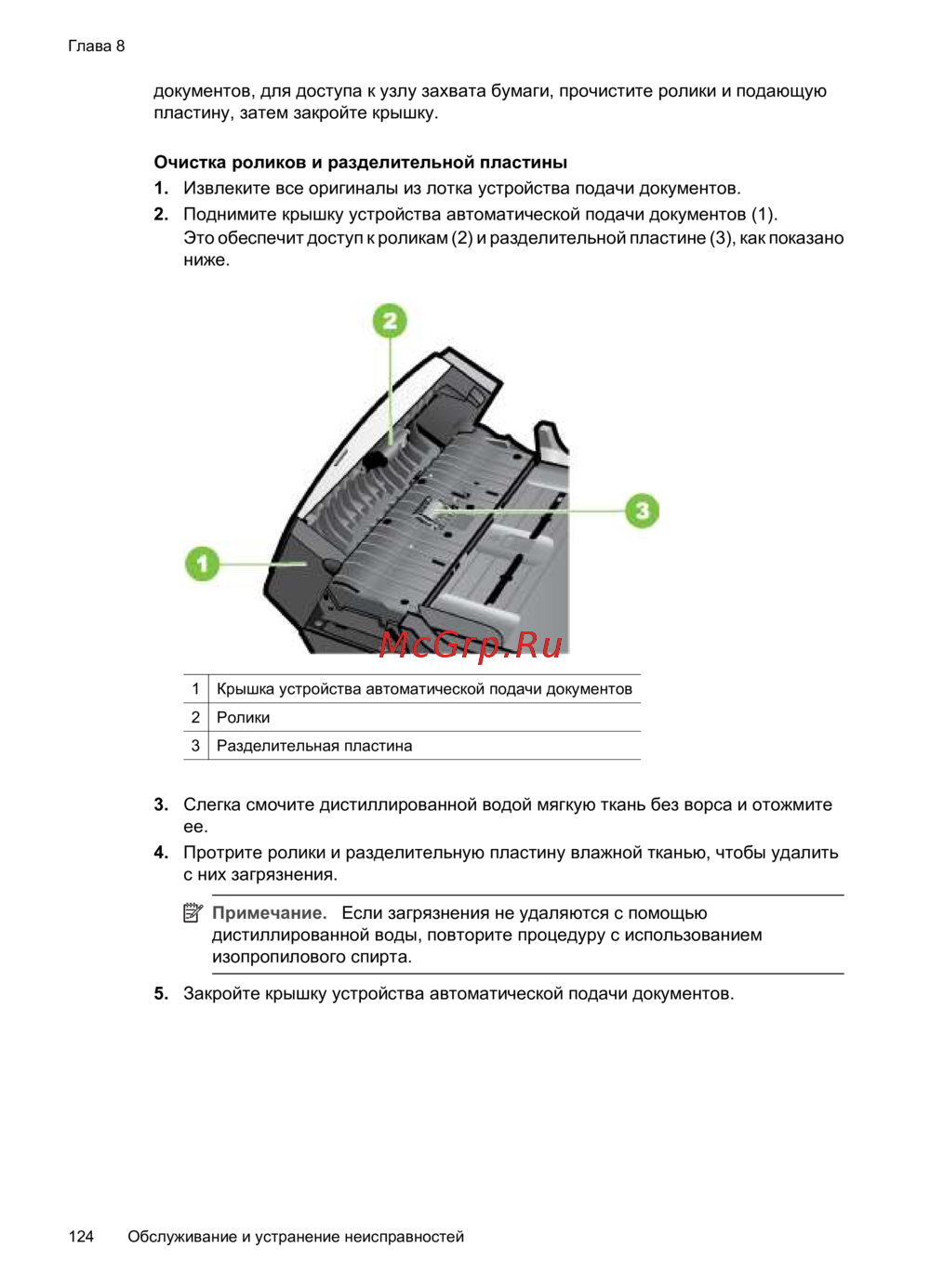 4. Протрите ролики и разделительную пластину влажной тканью, чтобы удалить