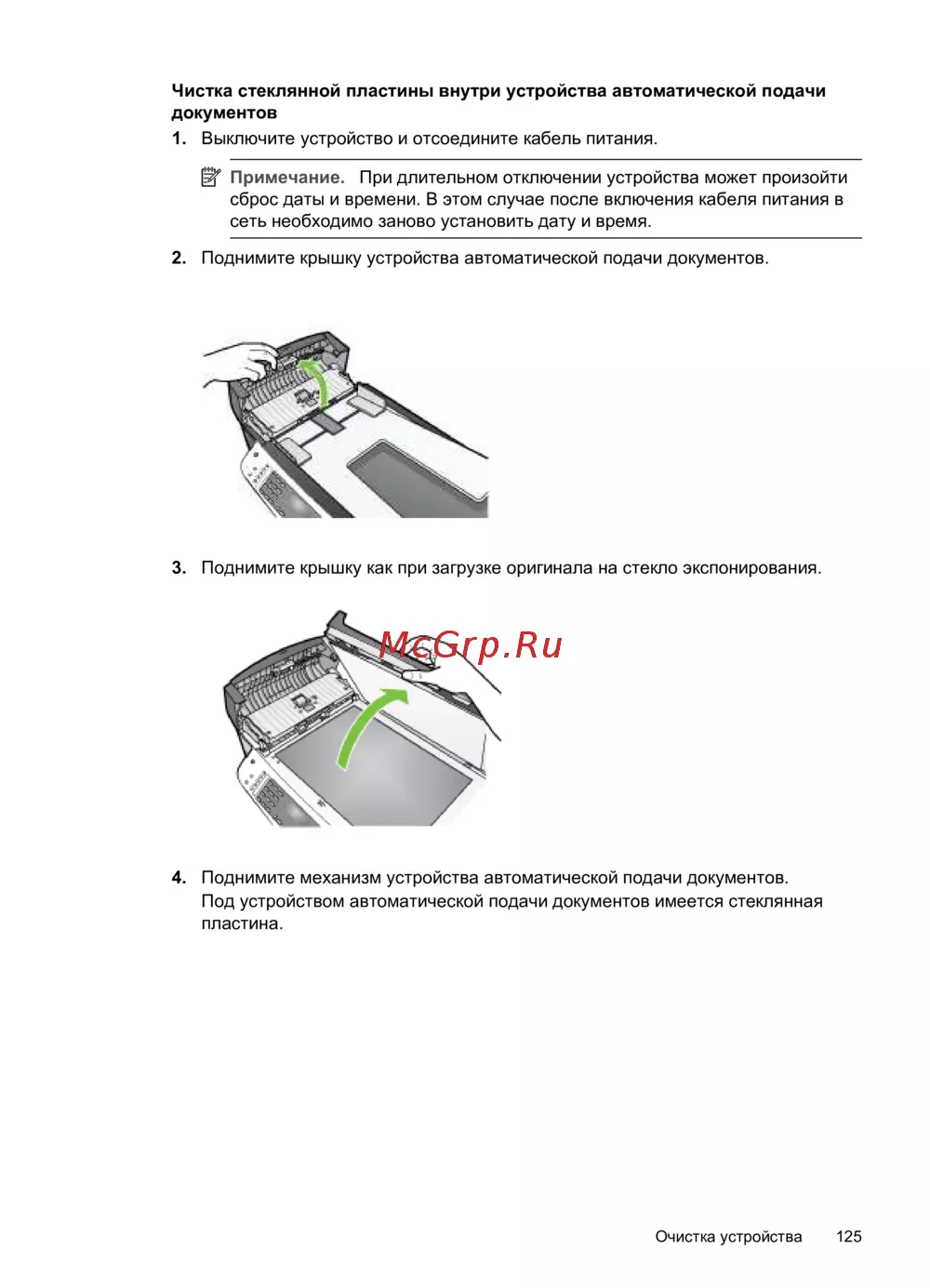4. Поднимите механизм устройства автоматической подачи документов.