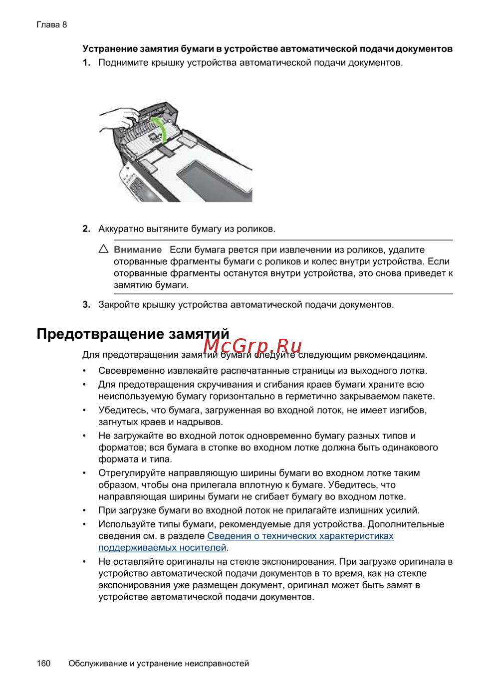 Устранение замятия бумаги в устройстве автоматической подачи документов