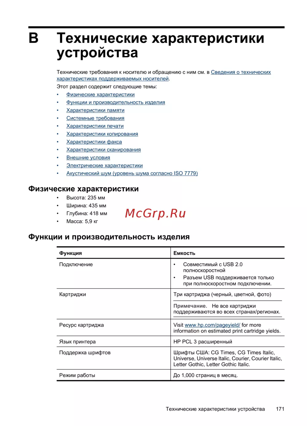 Технические характеристики устройства 171