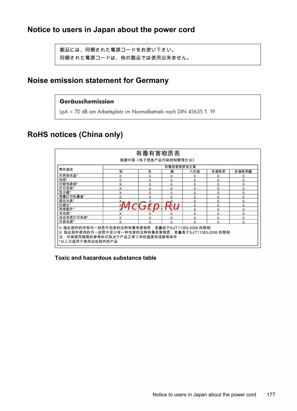 Notice to users in Japan about the power cord 177